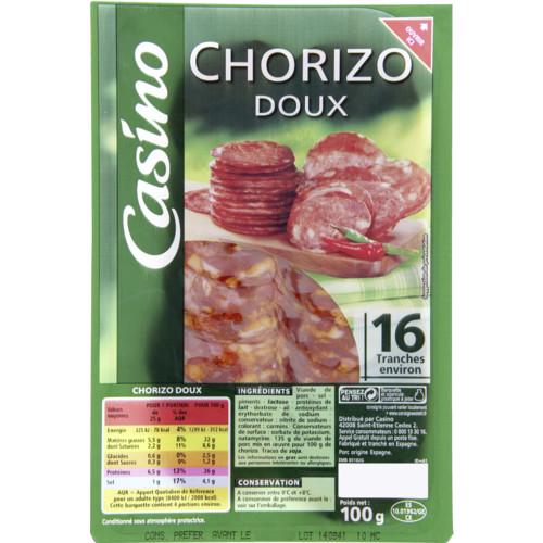 Chorizo doux. Ingrédients : Viande de porc - sel - piments - _lactose_ - protéines de _lait_ - dextrose - ail - antioxydant: érythorbate de...