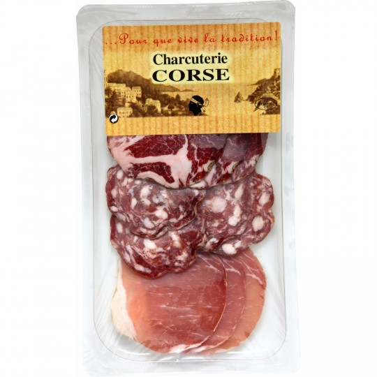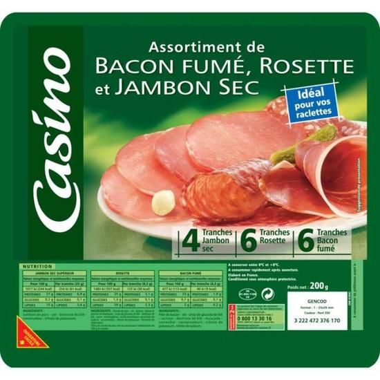 Jambon sec supérieur, rosette et bacon fumé. Ingrédients : Jambon sec superieur (50%) : jambon de porc - sel - dextrose - conservateur : nitrate...