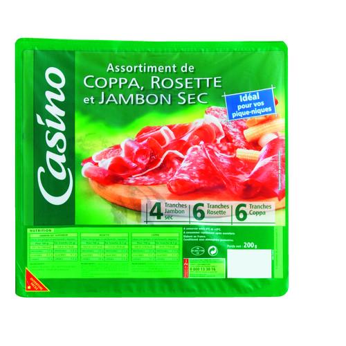 Jambon sec supérieur, rosette et coppa. Ingrédients : Jambon sec superieur (50%) : jambon de porc - sel - dextrose - conservateur : nitrate de...