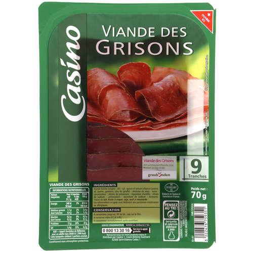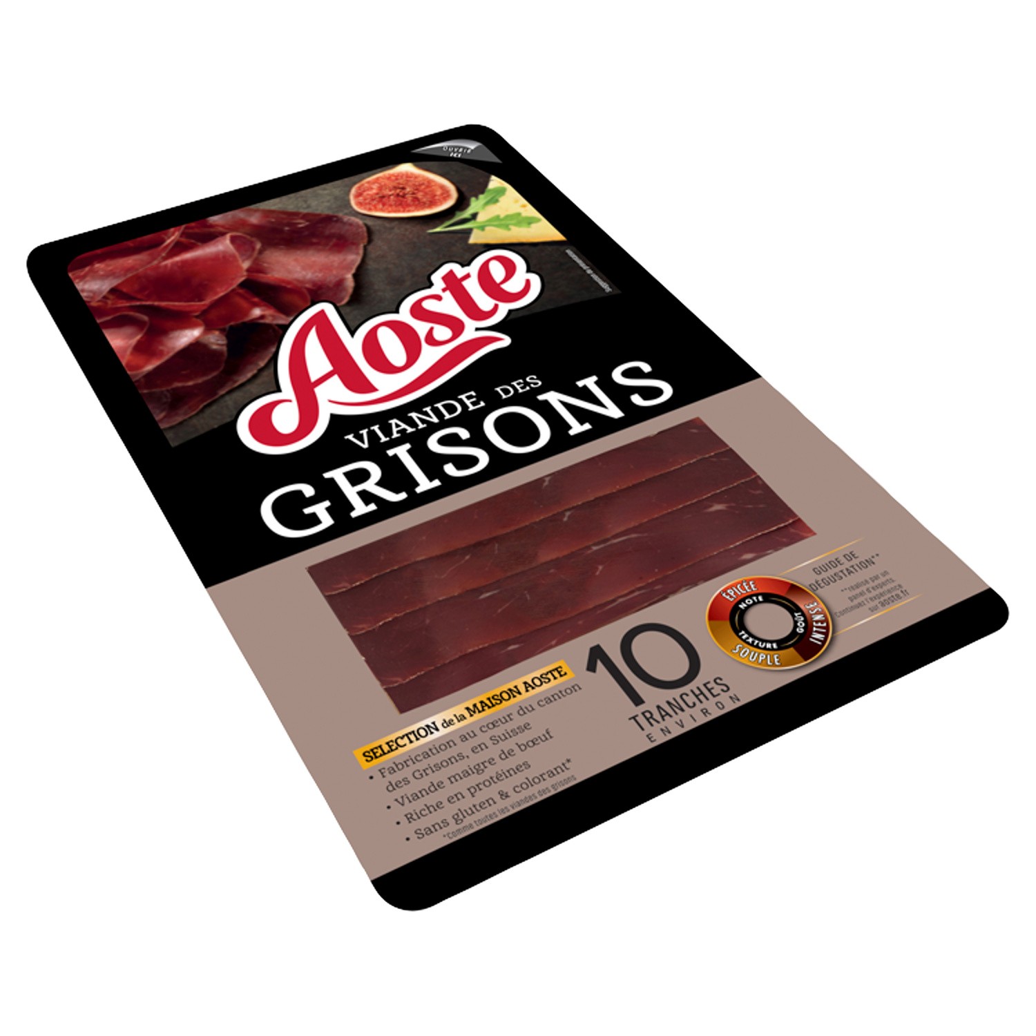 Viande des Grisons. Ingrédients : Viande bovine (origine : UE) - sel - épices et extraits d'épices (poivre, ail, laurier, genièvre, clou de girofle) -...
