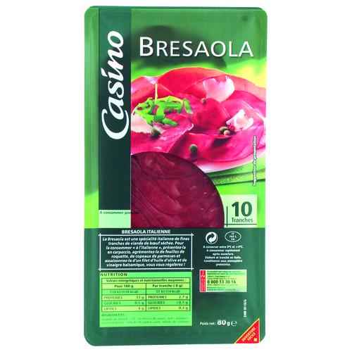 BRESAOLA italienne. Ingrédients : Viande bovine - sel - dextrose - arômes naturels - conservateurs : nitrate de potassium, nitrite de sodium. Quantité : 80...