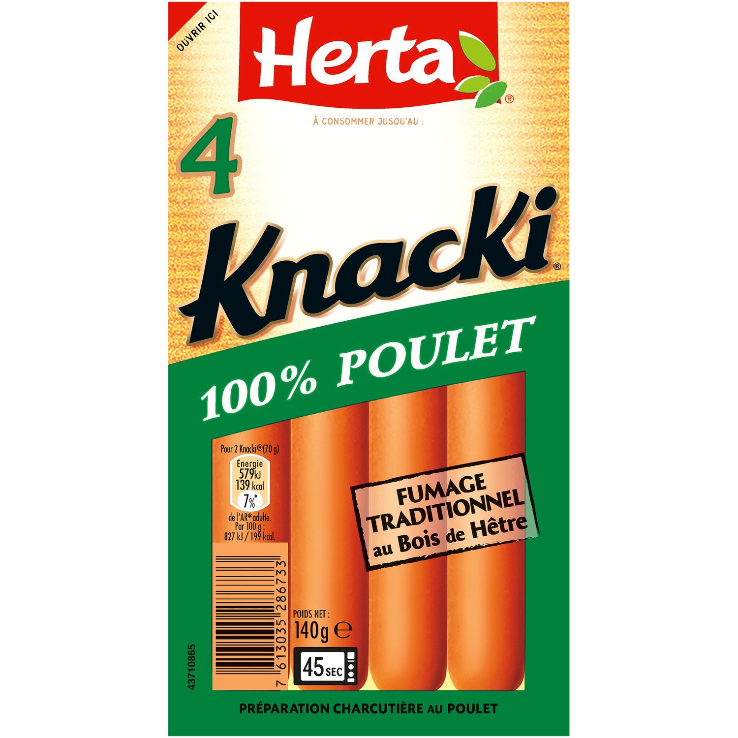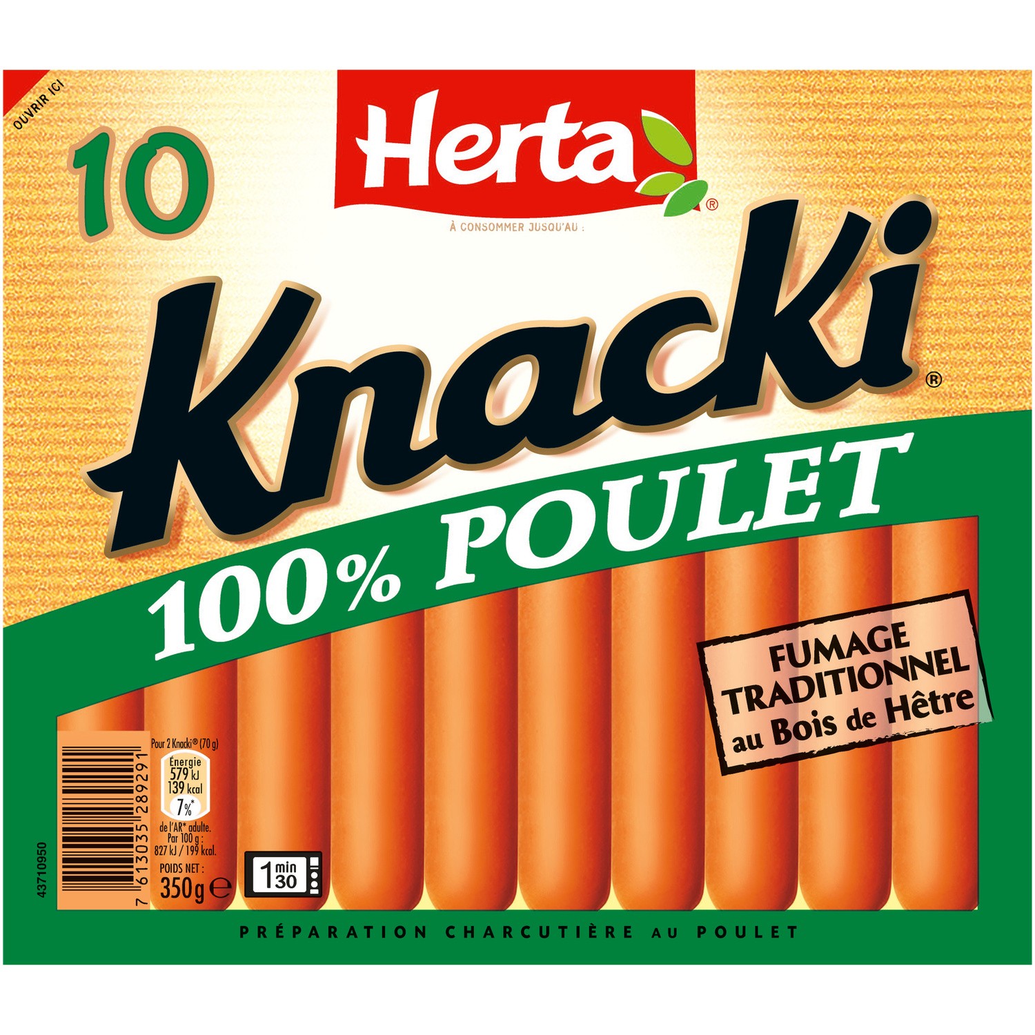 Knacki Herta. Ingrédients : Viande de poulet et peau de poulet (75 %), eau, _lactose_, Sel, Protéines de pois, Arômes (blé, _céleri_), Dextrose, Antioxydant :...