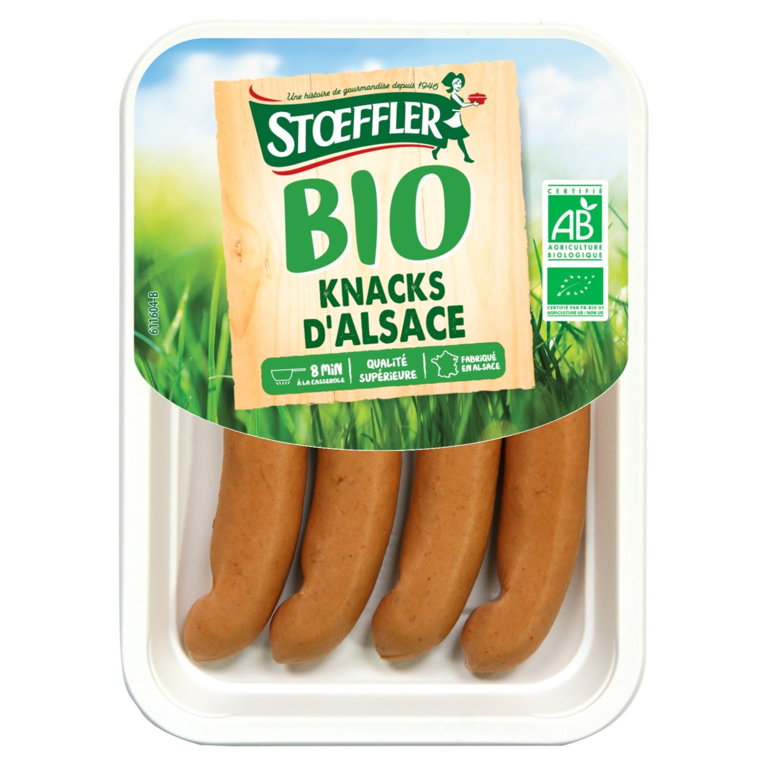 Knacks d'Alsace bio. Ingrédients : Viande de porc*, eau, gras de porc*, sel, épices et plantes aromatiques*, sirop de glucose*, dextrose*, sucre de canne*, arômes...