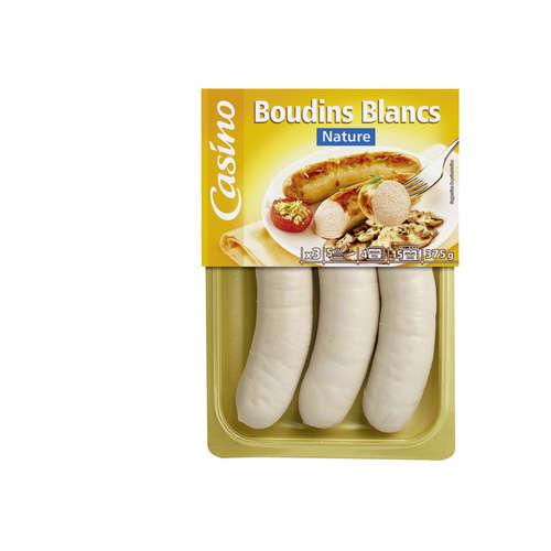 Boudins blancs nature. Ingrédients : Viande de porc 29% - _lait_ frais demi-écrémé pasteurisé - eau - gras de porc - viande de dinde 15%...