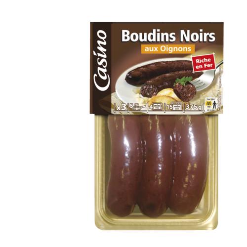 Boudins noirs aux oignons x2. Ingrédients : Sang de porc* (32 %), oignons grillés* (20 %), viande de porc*, gras de porc*, couenne de porc*,...