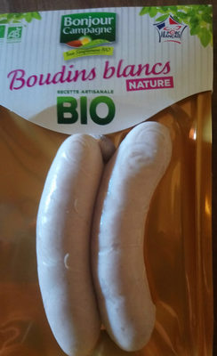 Bonjour Campagne Boudin Blanc Nature Bio. Ingrédients : viande de porc* (69%), lait*, blancs d’œufs*, farine de blé*, oignons*, sel, protéines de lait*, épices*, boyau...