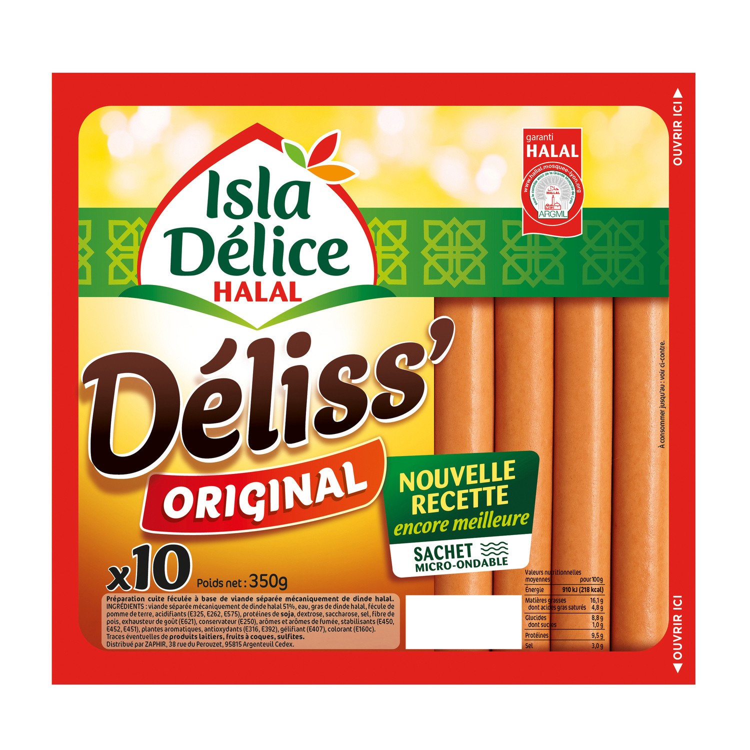 Déliss' Original. Ingrédients : viande séparée mécaniquement de dinde halal 64,3%, eau, fécule de pomme de terre, protéines de soja, dextrose, saccharose, sel, fibre de...