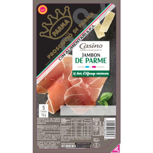 Prosciutto di Parma AOP, 14 mois d'affinage minimum. Ingrédients : Jambon de porc (origine : Italie) - sel. Quantité : 5 tranches (70 g) Marque...