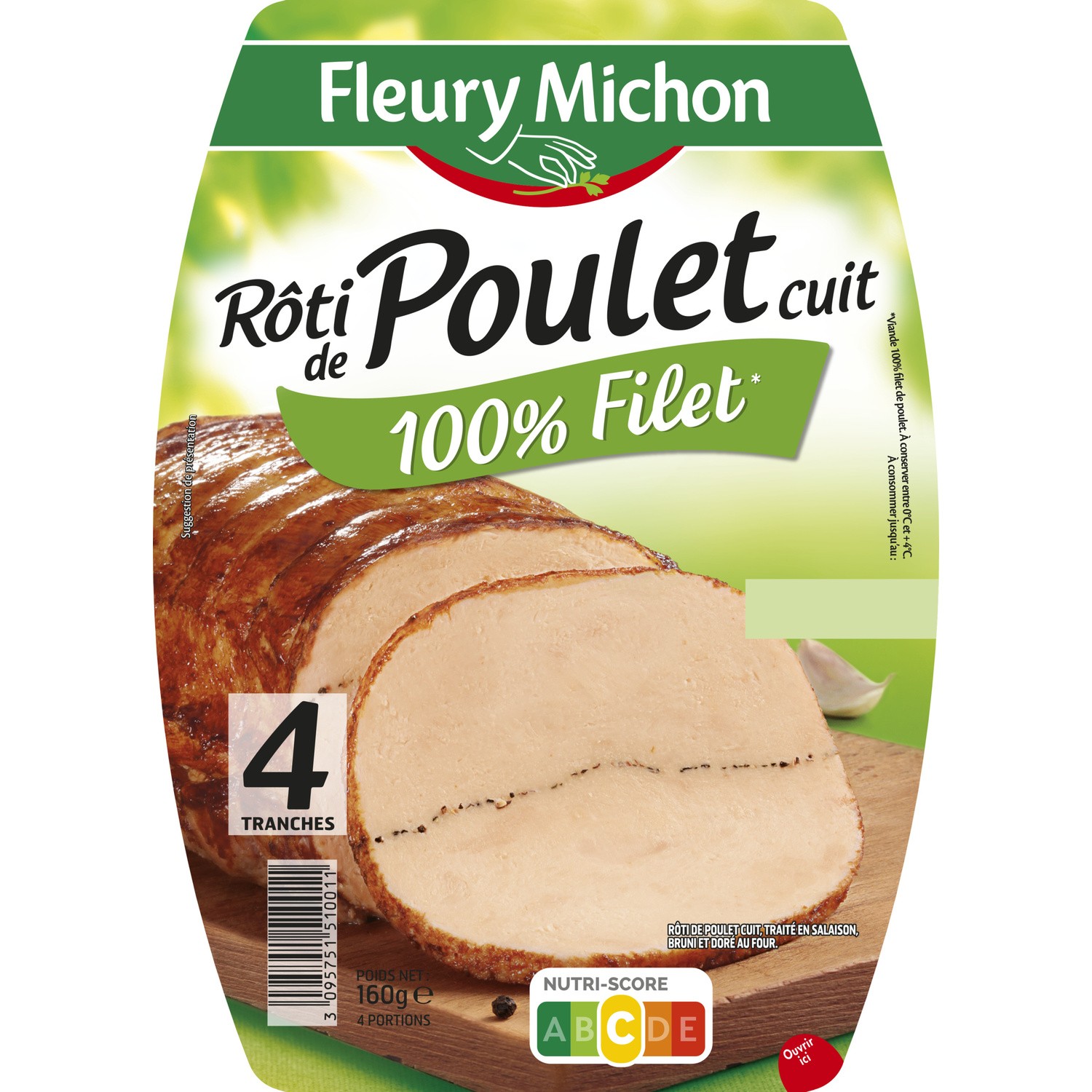 Rôti de poulet cuit 100% filet* - 4 tranches. Ingrédients : Filet de poulet 92%, sel, bouillons 1.3% (eau, os de poulet, ail 0.1%, carotte,...