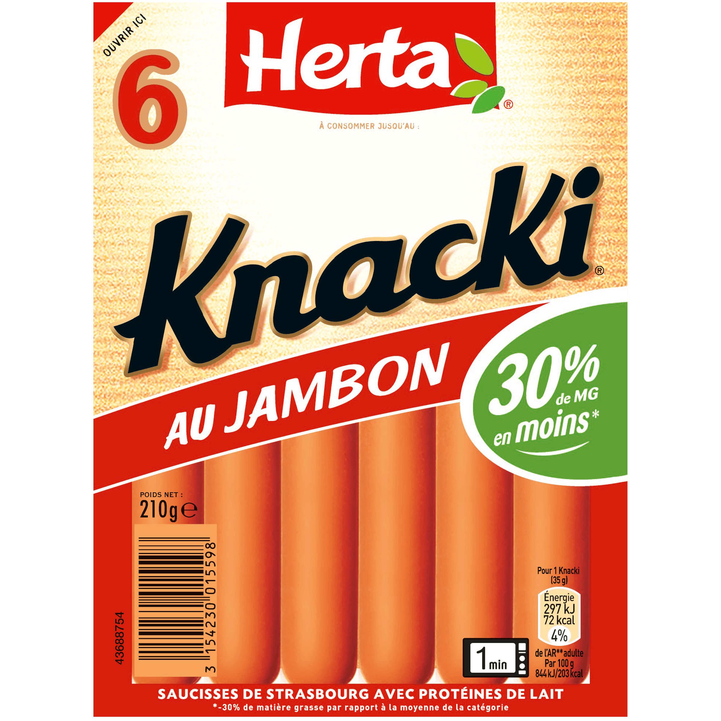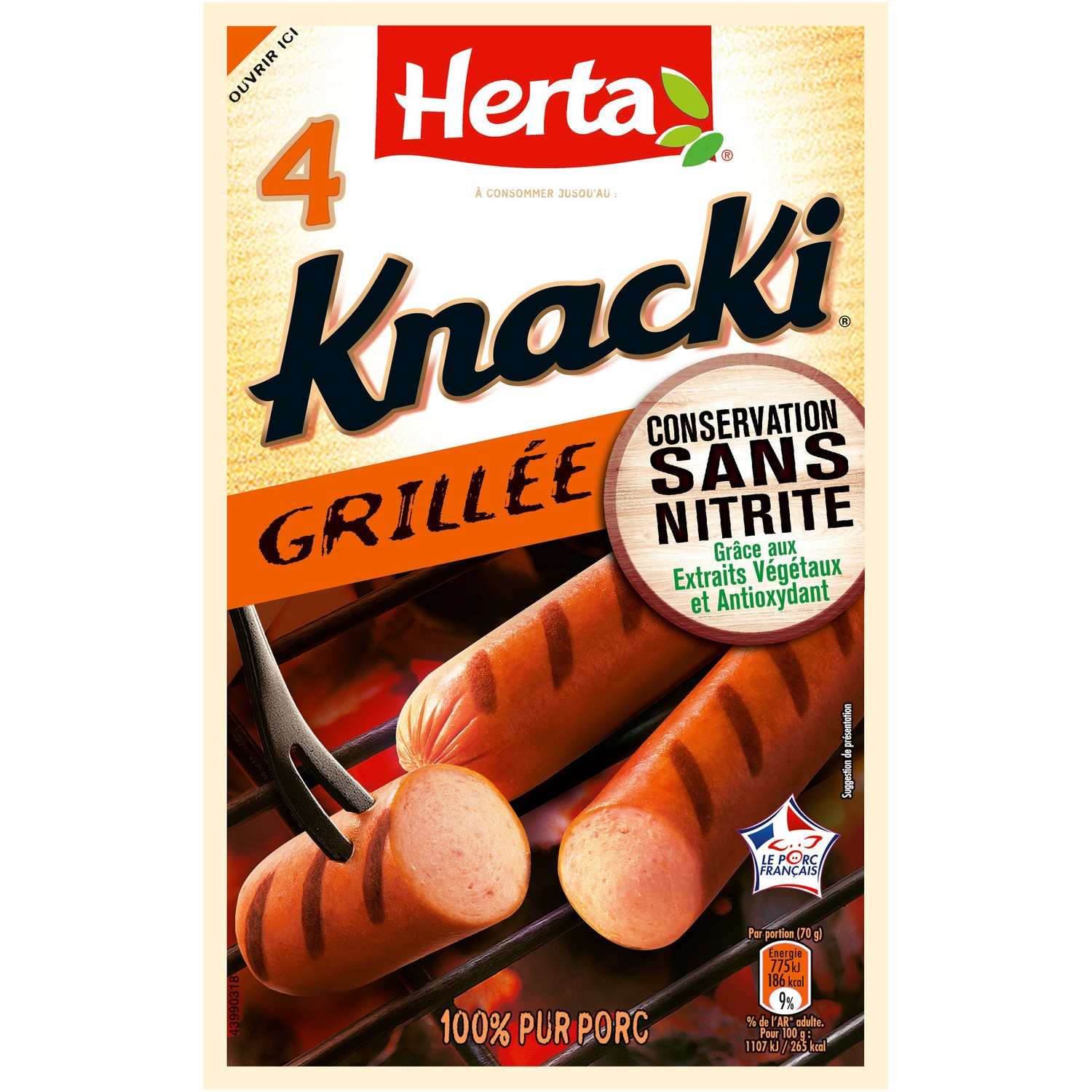 Knacki grillé sans nitrite. Ingrédients : Viande de porc, Eau, Grs de porc, Dextrose de mais, Sel, Fibre de ble, Protéine de pois, Arômes naturels...