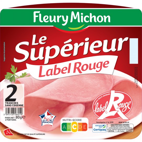 Jambon cuit supérieur sans couenne. Ingrédients : Jambon frais de porc Label Rouge, sel, bouillon de légumes (eau, _céleri_, carotte, jus concentré de _céleri_, oignon, poireau), fond...