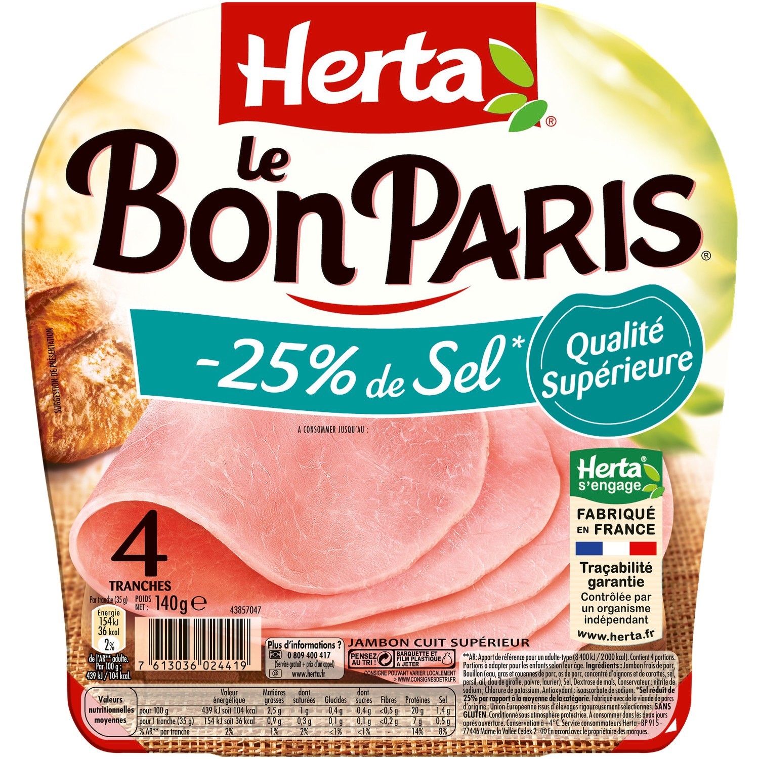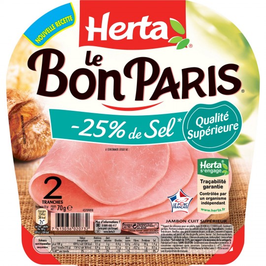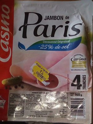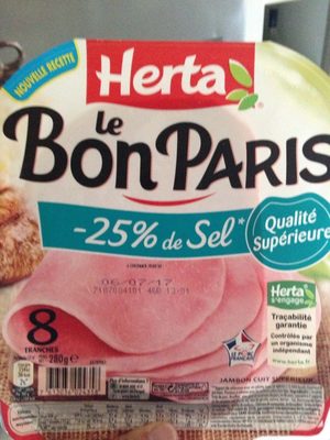 Le Bon Paris -25% de Sel. Ingrédients : Jambon frais de porc, Bouillon (eau, gras et couennes de porc, os de porc, concentré d'oignons et...
