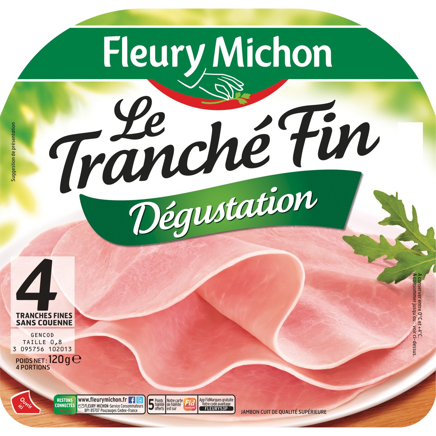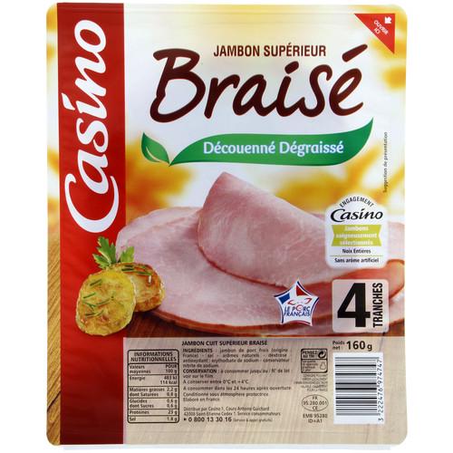 Jambon cuit supérieur. Ingrédients : jambon de porc frais (origine : France) - bouillon (eau - os et viande de porc) - sel - arômes...