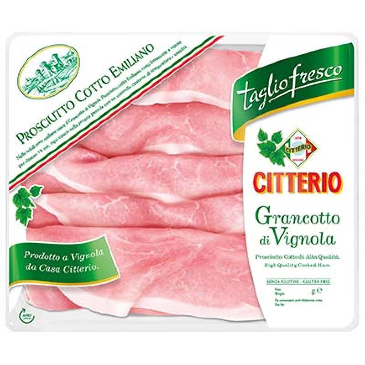 taglio fresco Grancotto di Vignola PROSCIUTTO COTTO DI VIGNOLA. Ingrédients : cuisse de porc. sel nitrite (sel de cuisine, conservateur: E 250), dextrose, sucre, arômes...