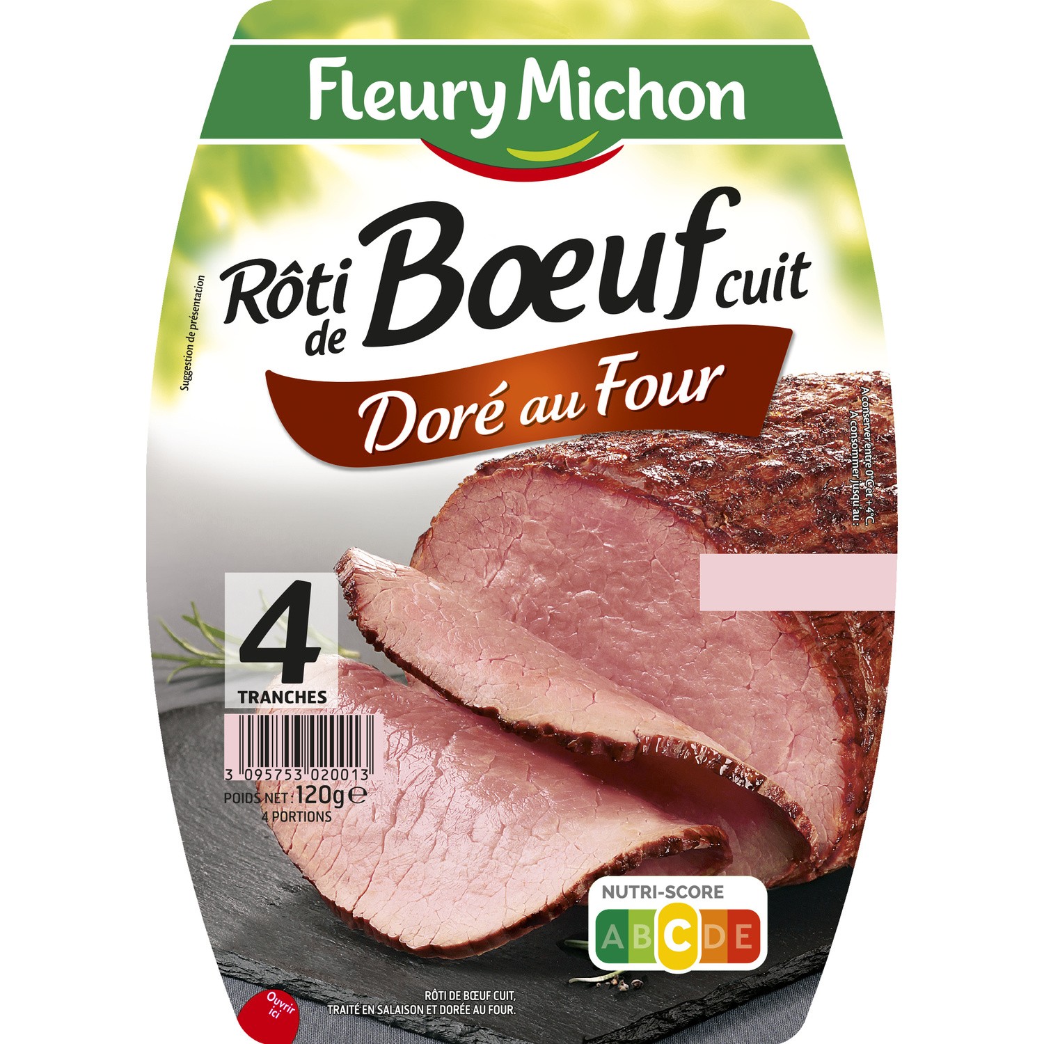 Rôti de boeuf cuit doré au four - 4 tranches. Ingrédients : Viande de boeuf, bouillons (eau, os de veau, carotte, oignon, _céleri_, vin blanc,...