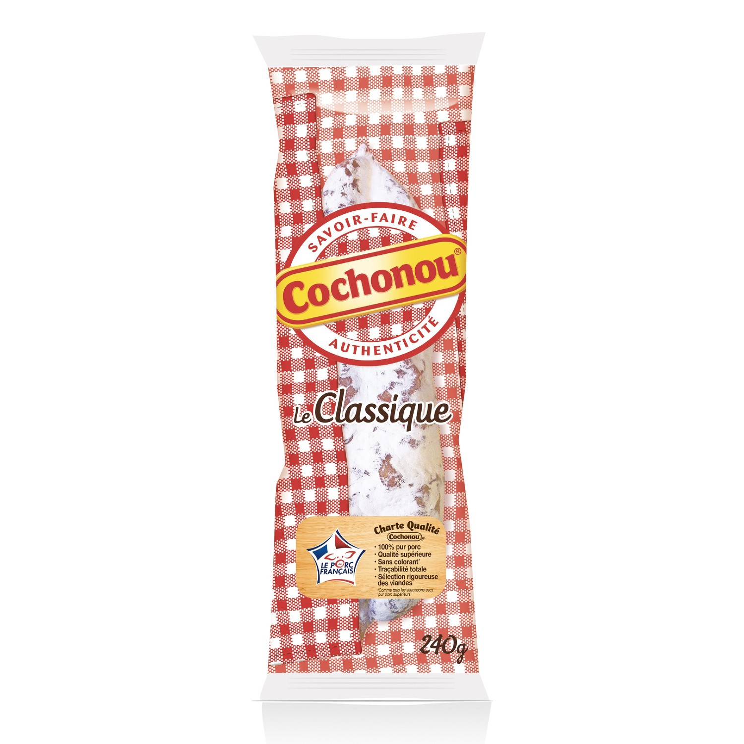 Sausisson. Ingrédients : Viande de porc origine France, sel, lactose, dextrose, sucre, épices, conservateurs: nitrate de potassium et nitrite de sodium, ferments. Boyau naturel de...