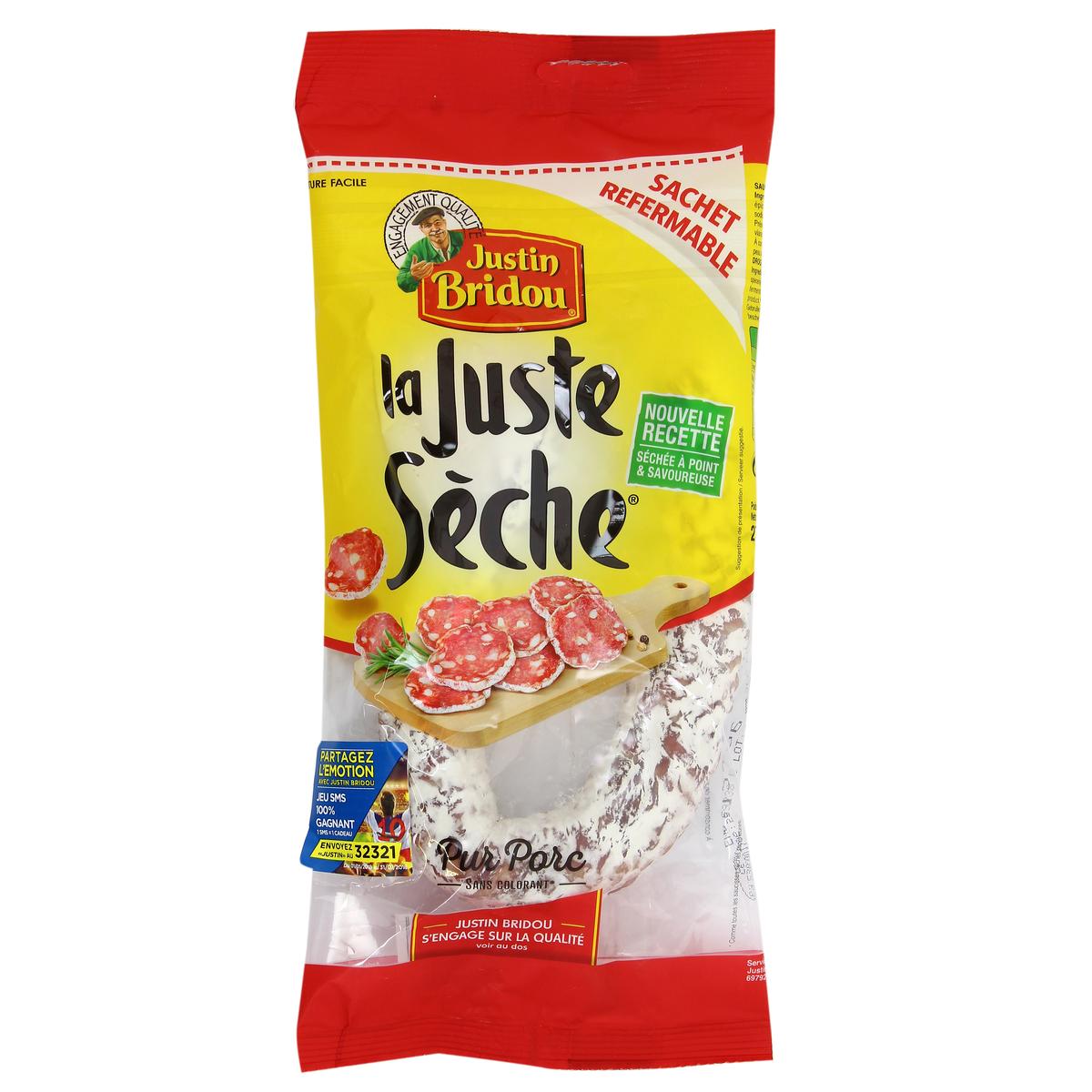 La juste sèche. Ingrédients : Viande de porc, sel, lactose, dextrose, épices et plantes aromatiques (dont coriandre et macis), sucre, arômes naturels, conservateurs : nitrate...