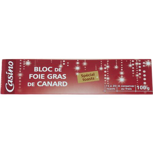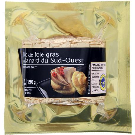 Bloc de foie gras de canard. Ingrédients : Foie gras de canard (origine : France) - eau - Armagnac - sel - sucre - poivre...