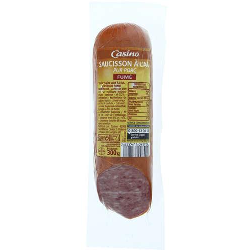 Saucisson Cuit à l'Ail Supérieur Fumé. Ingrédients : Viande de porc 93 %, Eau, sel ail 0.24%, sirop de glucose, dextrose, arôme, stabilisant : polyphosphates...