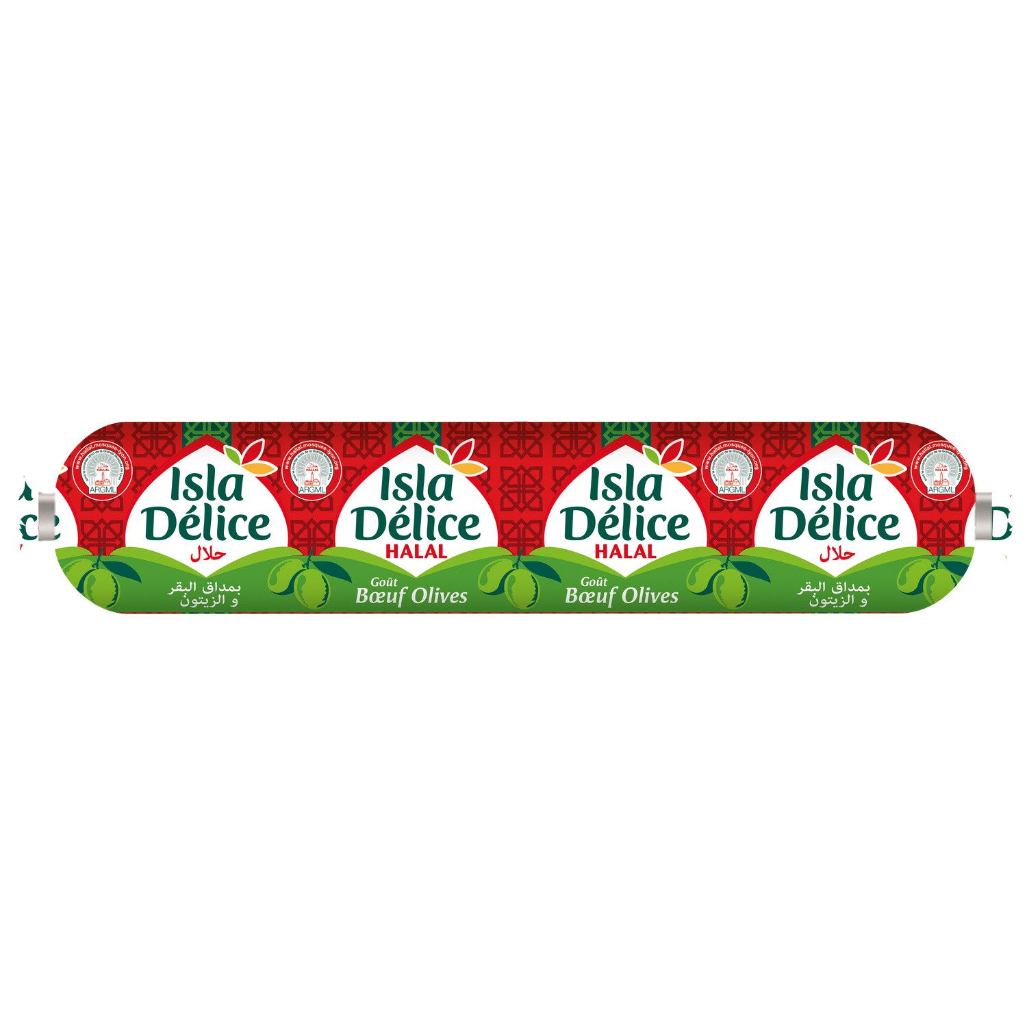 Saucisdelice Volaille / Boeuf,. Ingrédients : Viande séparée mécaniquement de dinde halal 51%, eau, fécule de pomme de terre, olives vertes 3,7%, viande de dinde,...