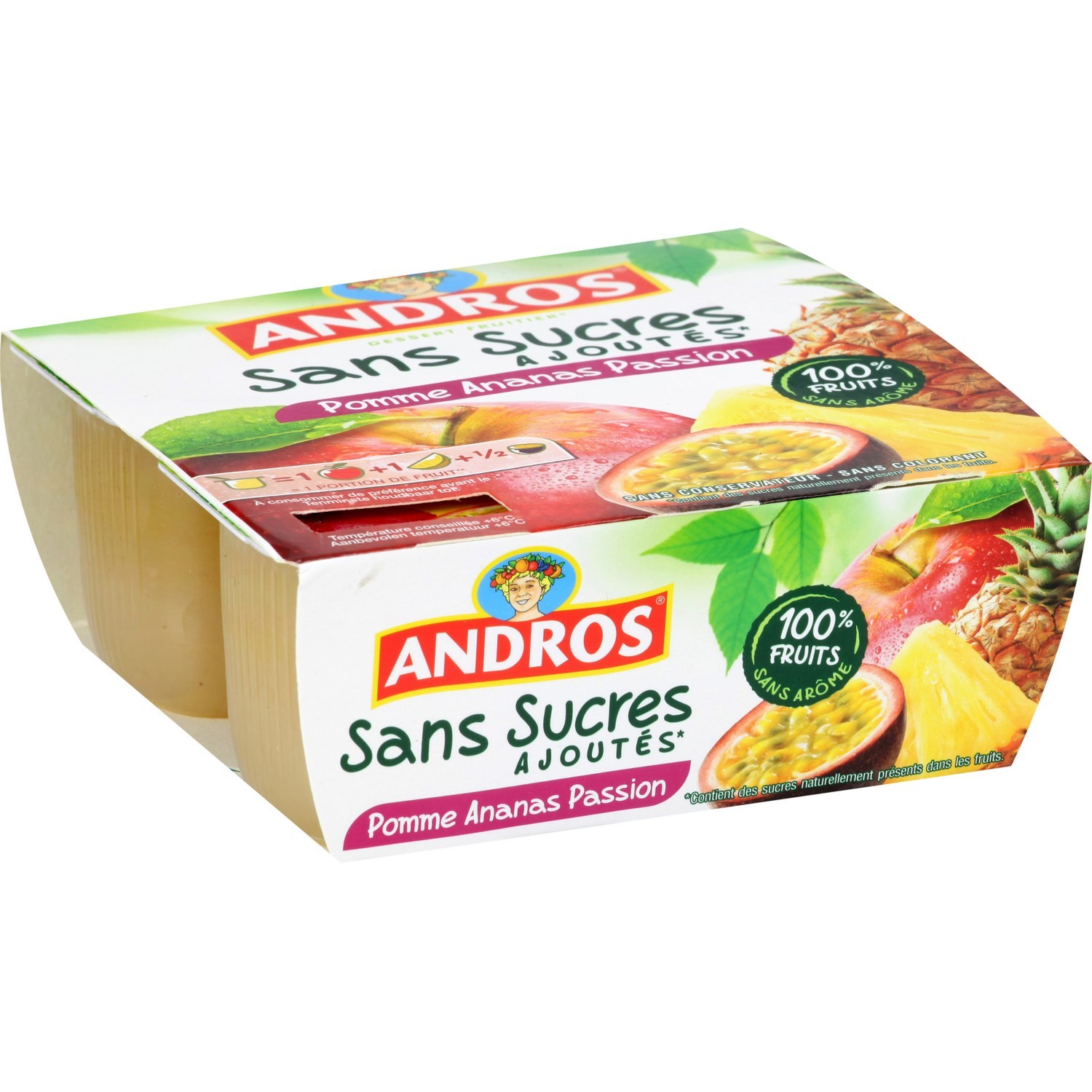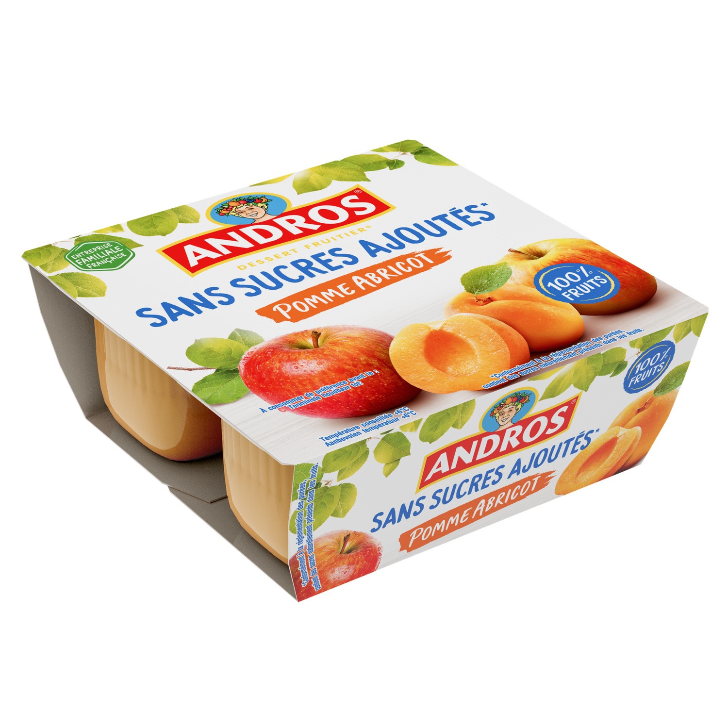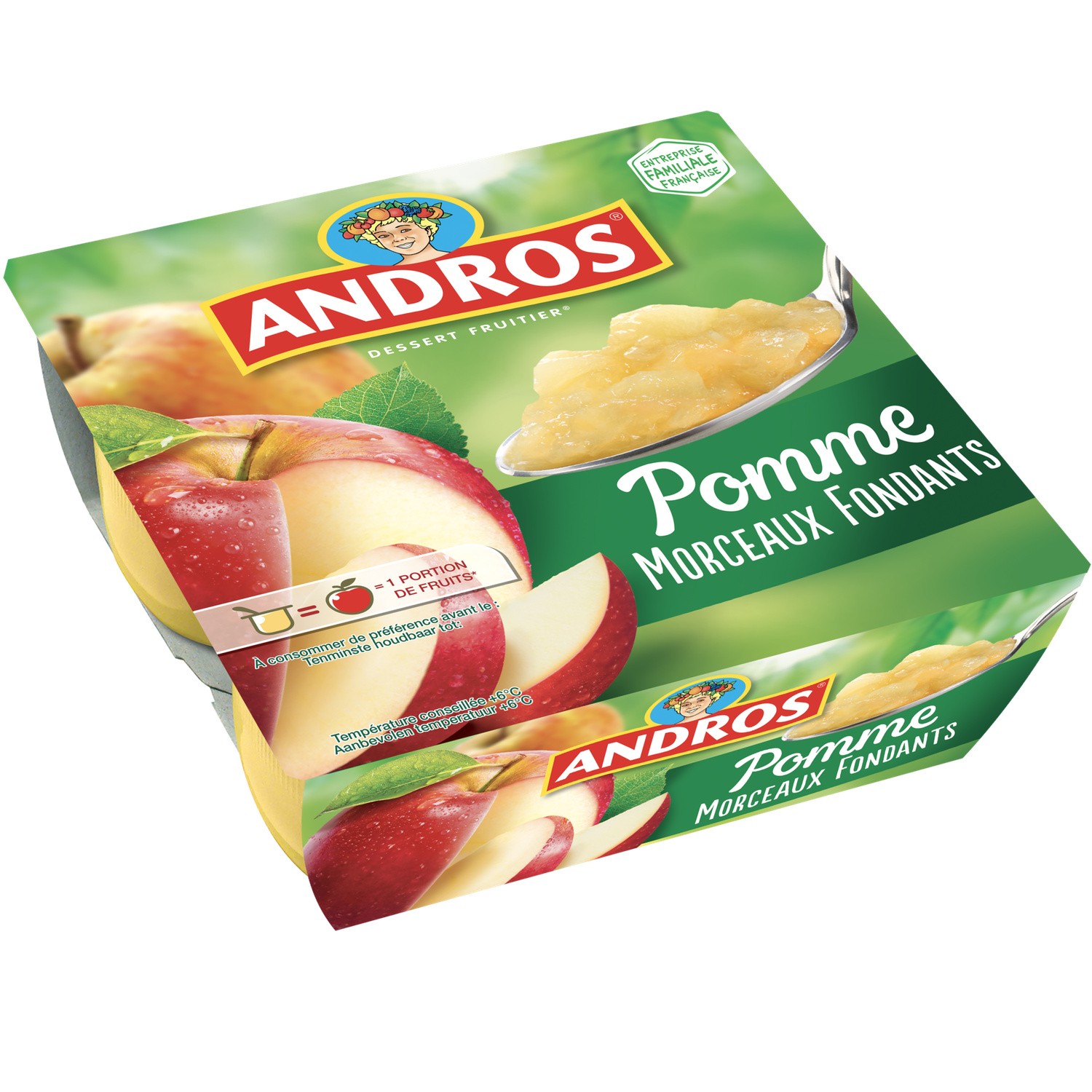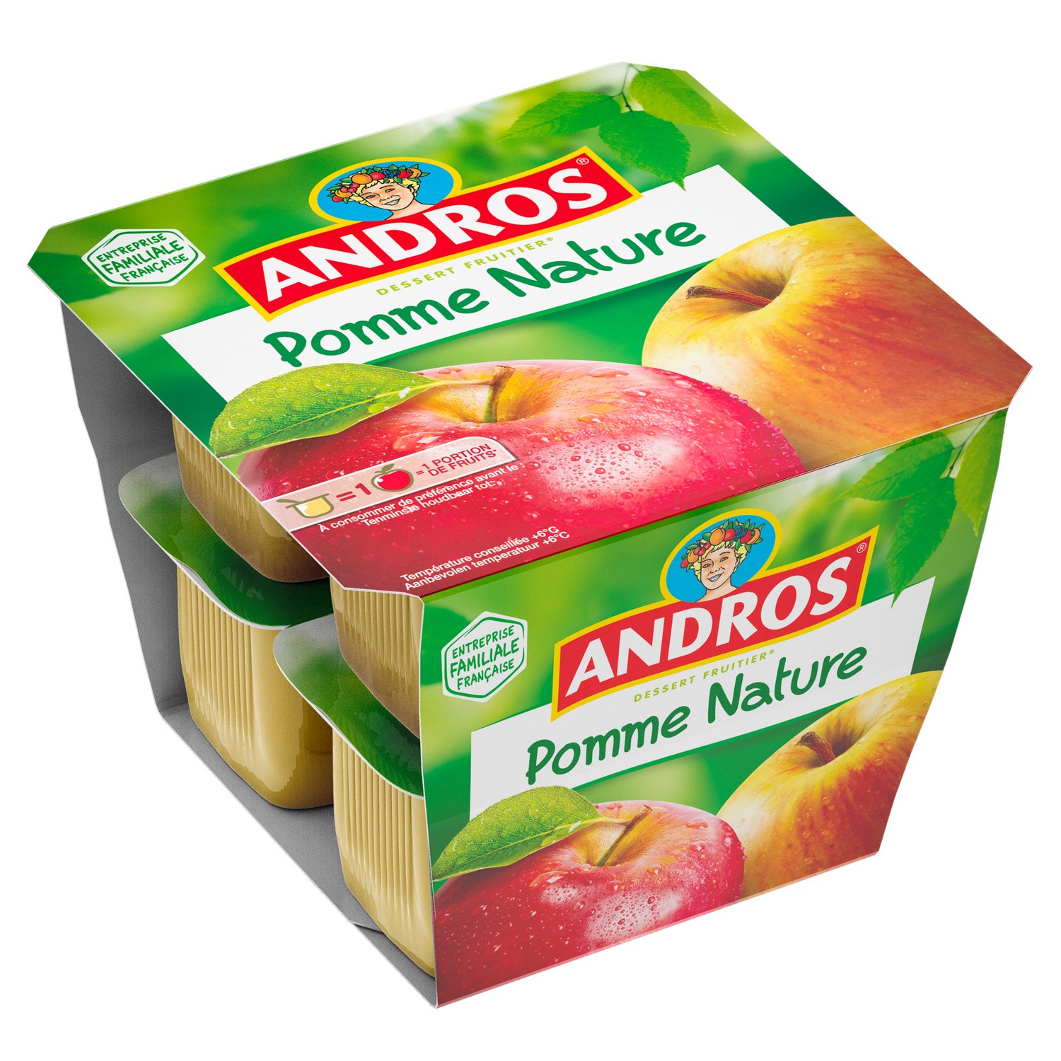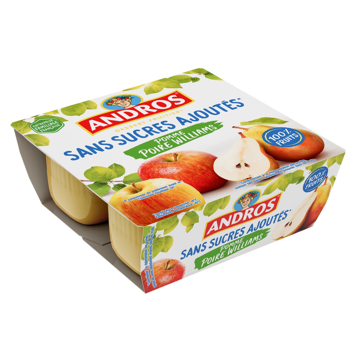 Dessert fruitier Pomme Poire. Ingrédients : pommes 54,8%, poires 45%, jus de d'acérola. Quantité : 400 g Marque : Andros