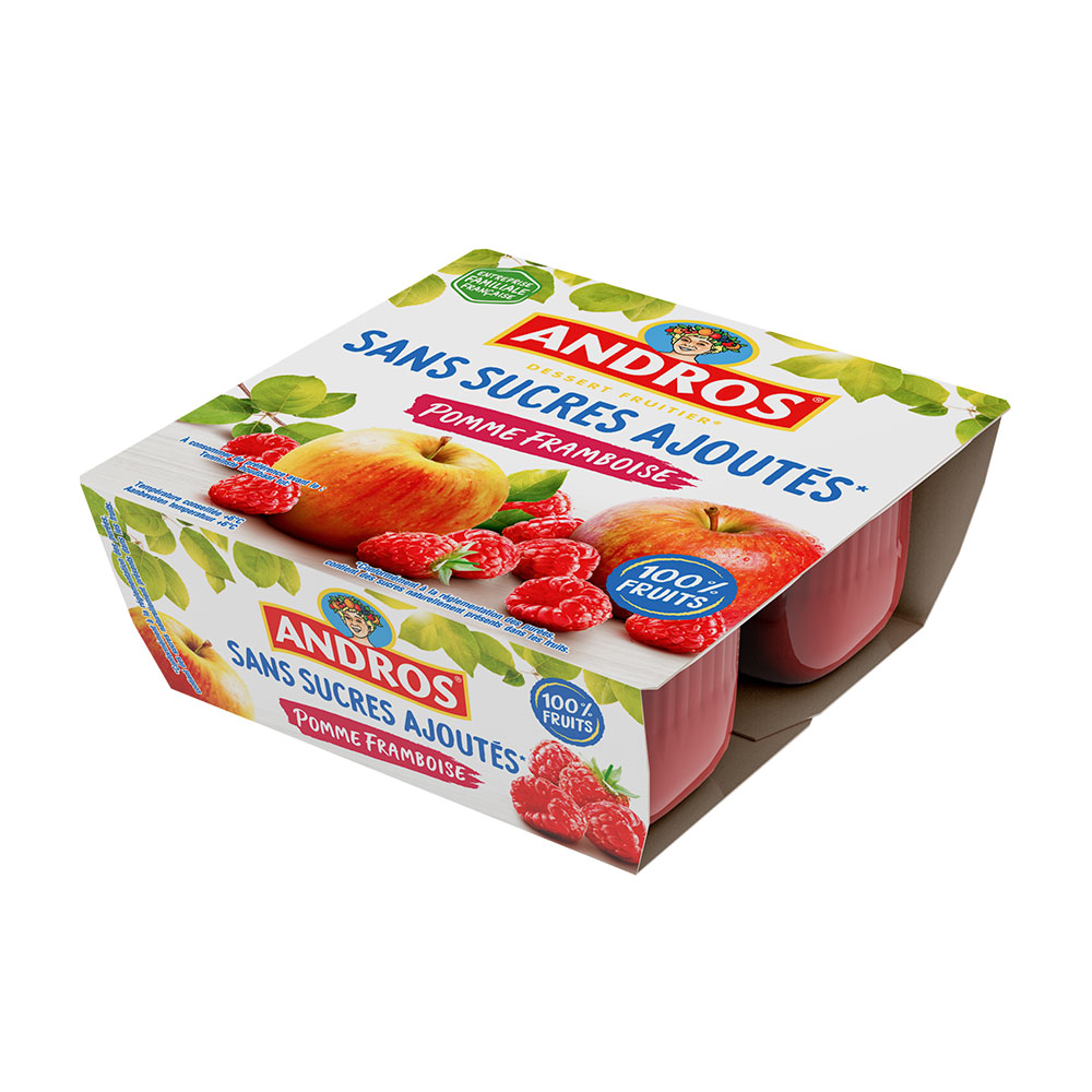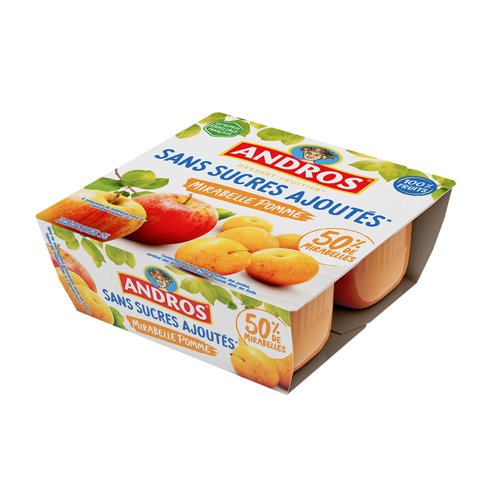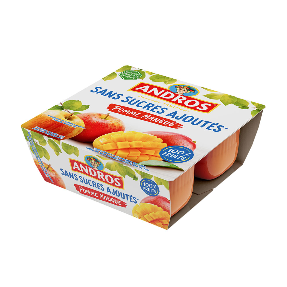 Dessert fruitier Pomme Mangue. Ingrédients : Pommes (purée et purée concentrée) 74,9%, mangues 25%, jus concentre d’acérola. Quantité : 400 g e (4 * 100...