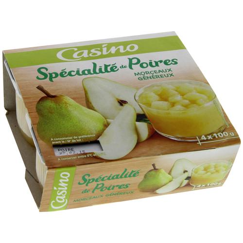Spécialité de fruits avec morceaux. Ingrédients : Poires 94 % - sucre - gélifiant: pectine de fruits - fibres de citrons - correcteur d'acidité :...