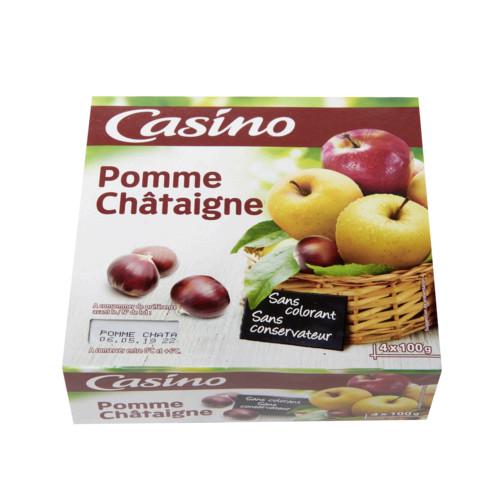 Spécialité de pommes et de châtaignes. Ingrédients : Purée de pomme 60% - sucre - châtaignes 16% - extrait de vanille - acidifiant : acide...