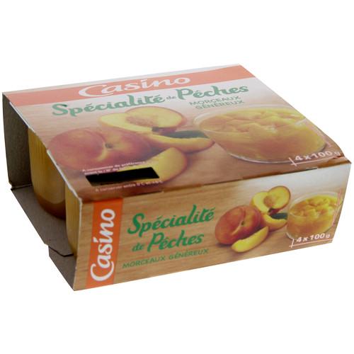 Spécialité de fruits avec morceaux. Ingrédients : Pêches 88.8% - sucre - gélifiant: pectine de fruits - fibres de citrons - correcteur d'acidité : citrate...