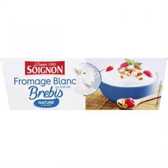Fromage blanc au lait de brebis. Ingrédients : _Lait_ entier de brebis pasteurisé (origine UE), ferments lactiques (lait). Quantité : 4 × 100 g Marque...
