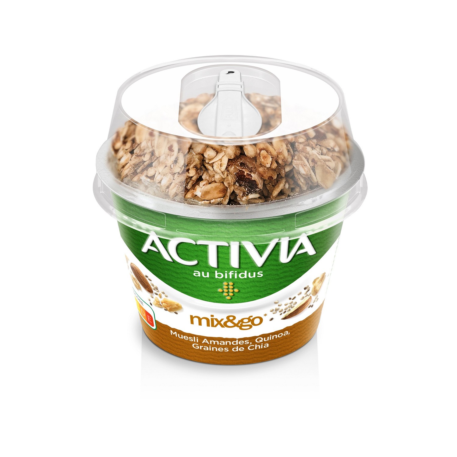 Activia mix and go. Ingrédients : lait fermenté sucré au bifidus (88,2%): lait demi écrémé, lait écrémé en poudre, sucré (3,1%), protéines de lait, ferments...