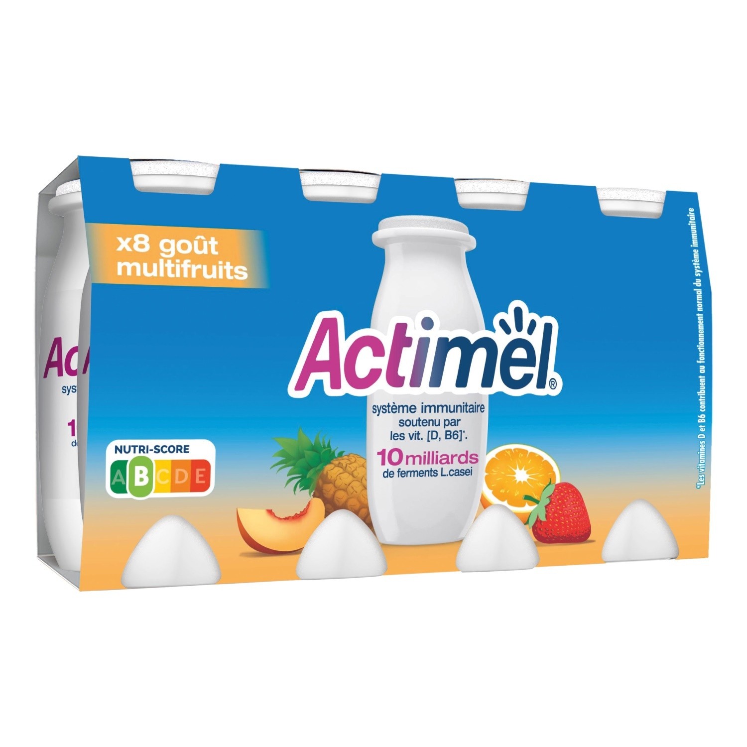 Actimel Gout Multi Fruits. Ingrédients : lait fermenté avec Lactobacillus casei, sucre liquide et sucre (saccharose : 9%), jus de fruits ù base de concentrés...