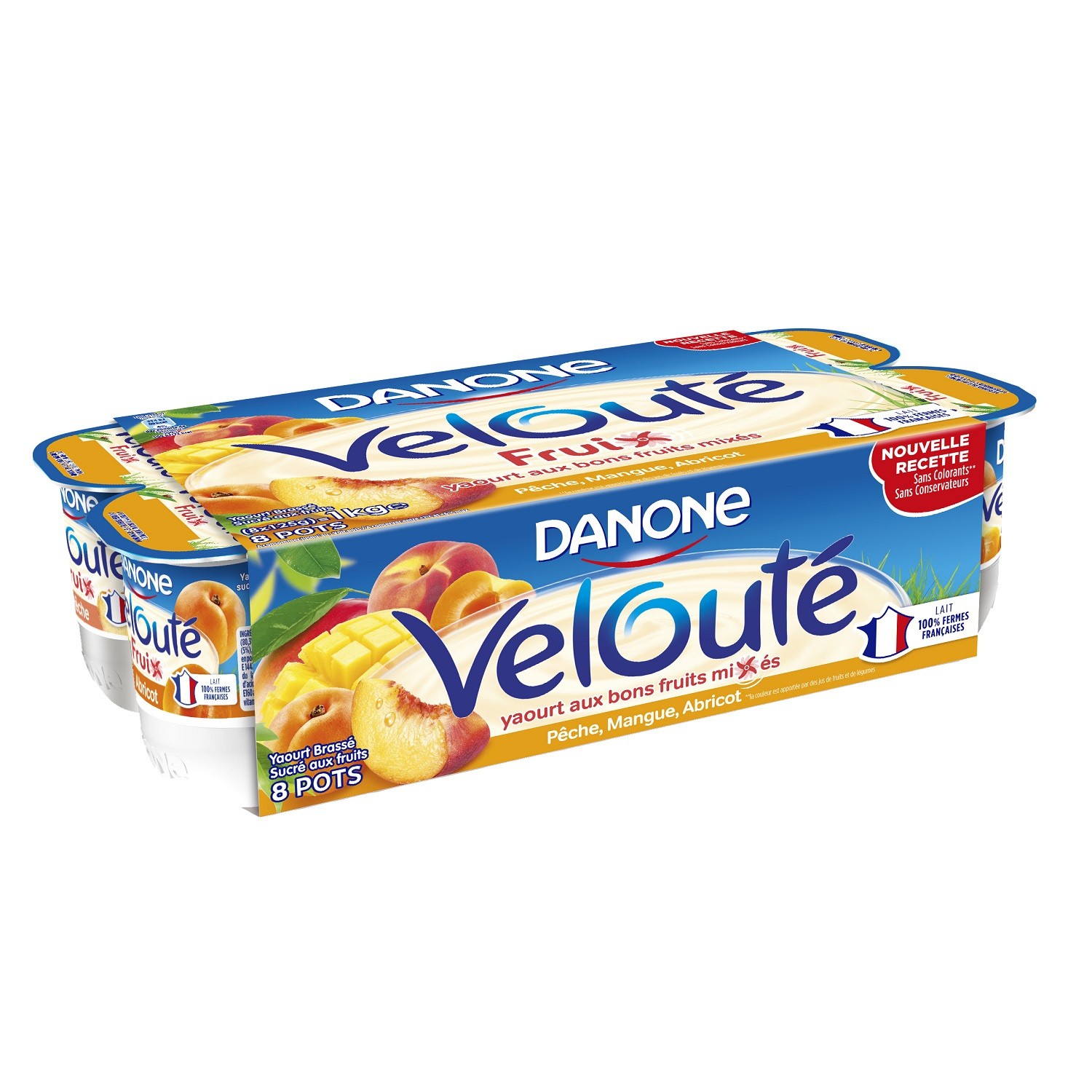 yaourts brassés sucrés aux fruits. Ingrédients : _Lait_ entier; fruits: abricots 18% ou (ananas 11,6% et jus de fruit de la passion 6,4%) ou cerises...