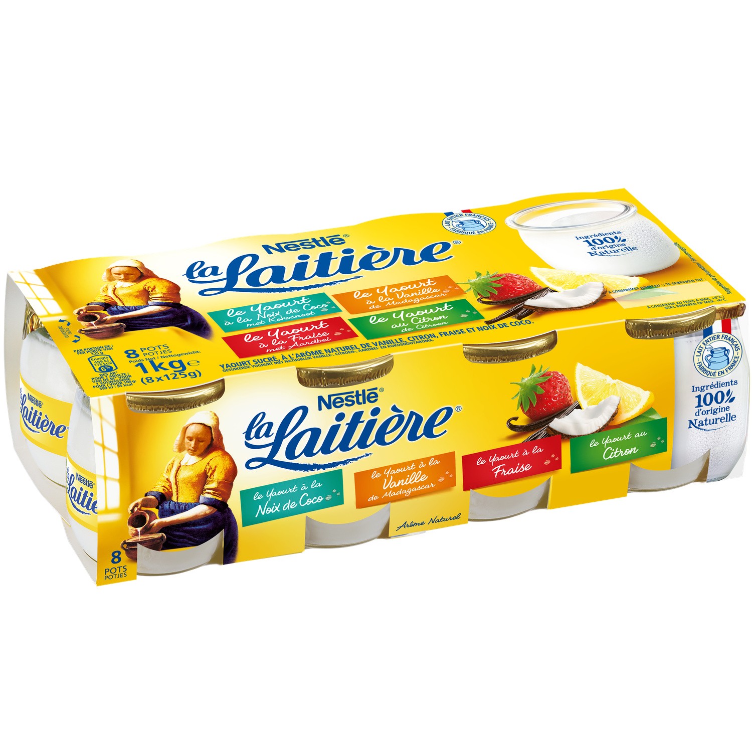 Assortiment de Yaourts au Lait Entier Aromatisés Noix de Coco, Vanille, Fraise et Citron. Ingrédients : _Lait_ entier (85,8%), sucre (9,5%), ferments lactiques, poudre de...