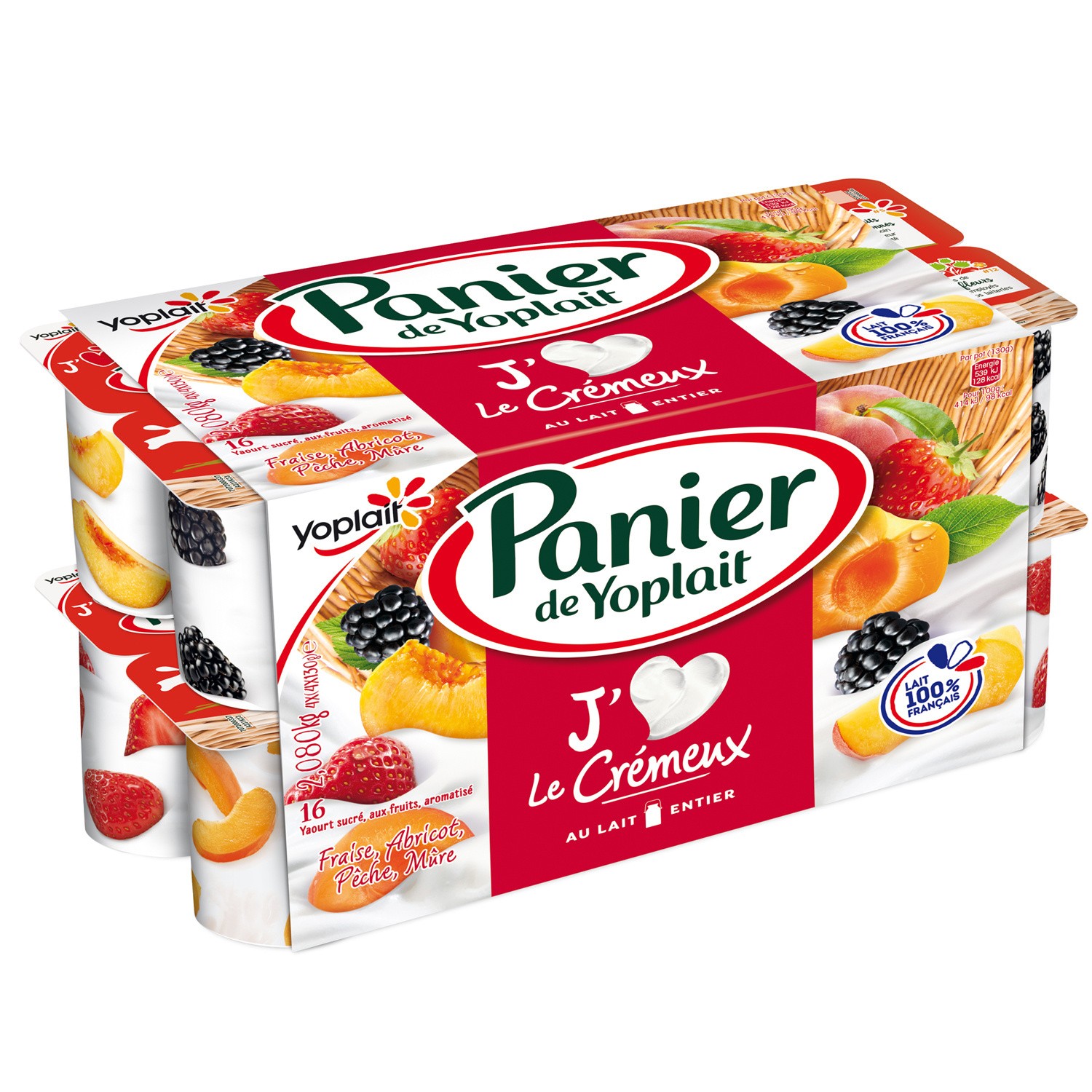 Yaourt sucré au lait entier, à la crème et aux fruits. Ingrédients : _lait_ entier 64.4% - fruits 10,5% (fraise ou abricot ou poire ou...
