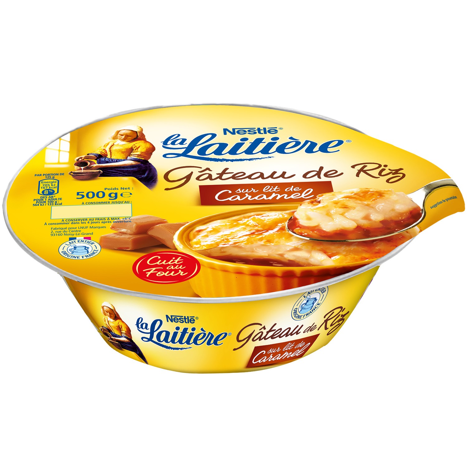 Gâteau de riz aux oeufs extra-frais et au caramel. Ingrédients : _Lait_ entier origine France 63,8% - sucre - riz rond de Camargue 10.4% -...