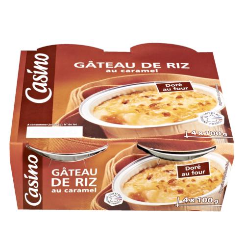 Gâteau de Riz sur Lit de Caramel. Ingrédients : Lait entier (43,5%), eau, riz (12,3%), sucre, caramel (5,6%) [sucre eau, œufs entiers (4,4%), blancs d'œufs,...