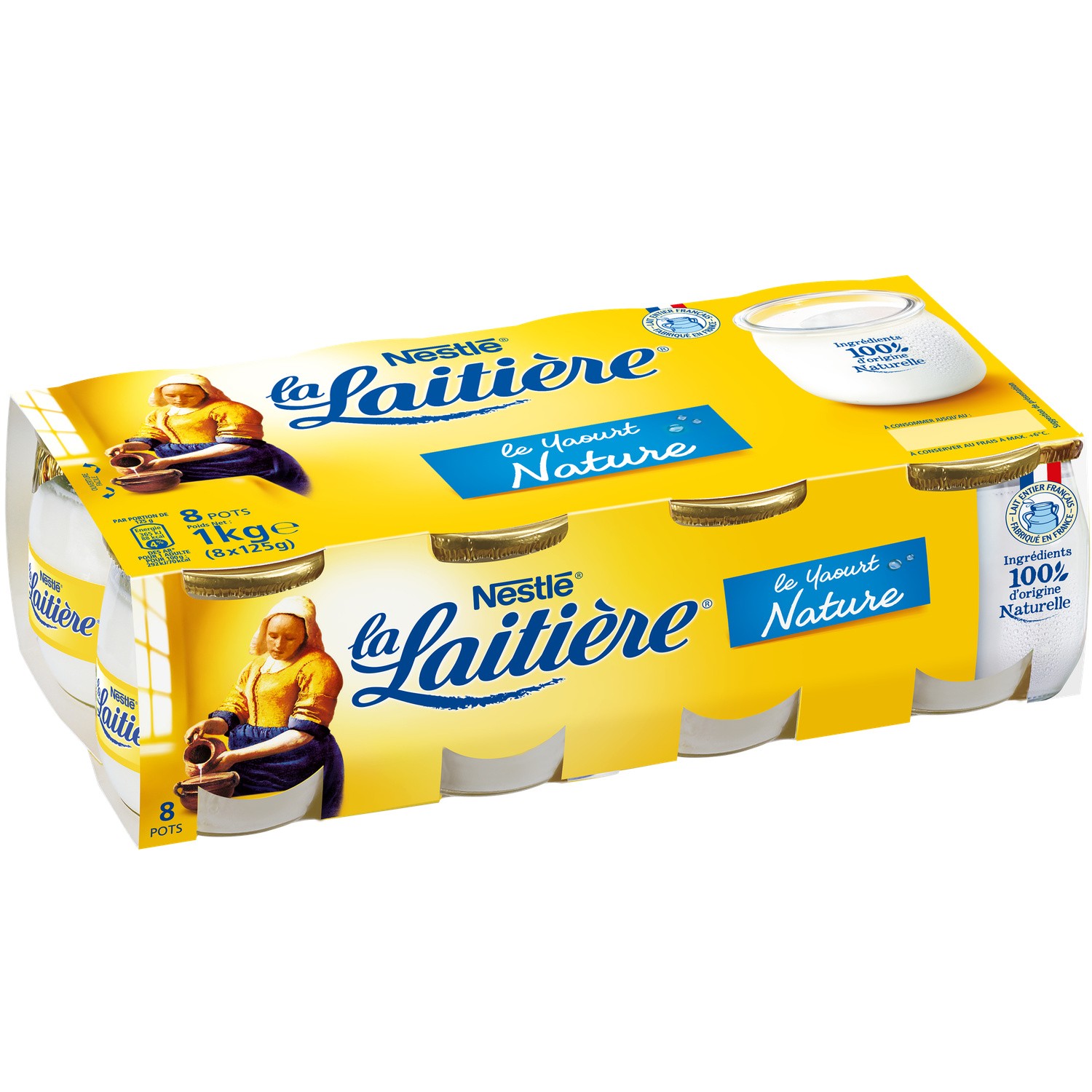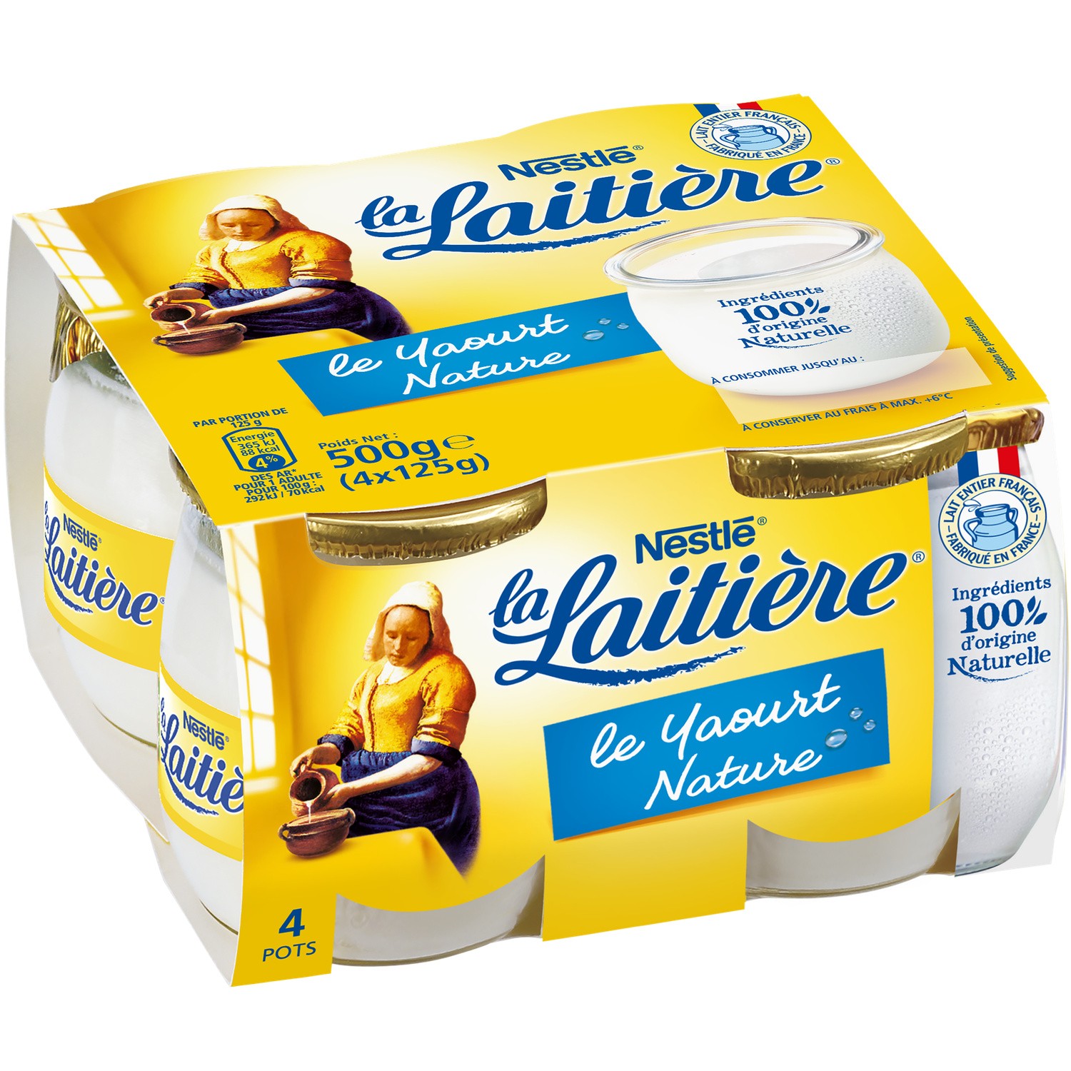 Le Yaourt Nature. Ingrédients : _Lait_ entier (90,3%), crème, ferments lactiques. Quantité : 500 g (4 * 125 g e) Marque : La Laitière,Nestlé