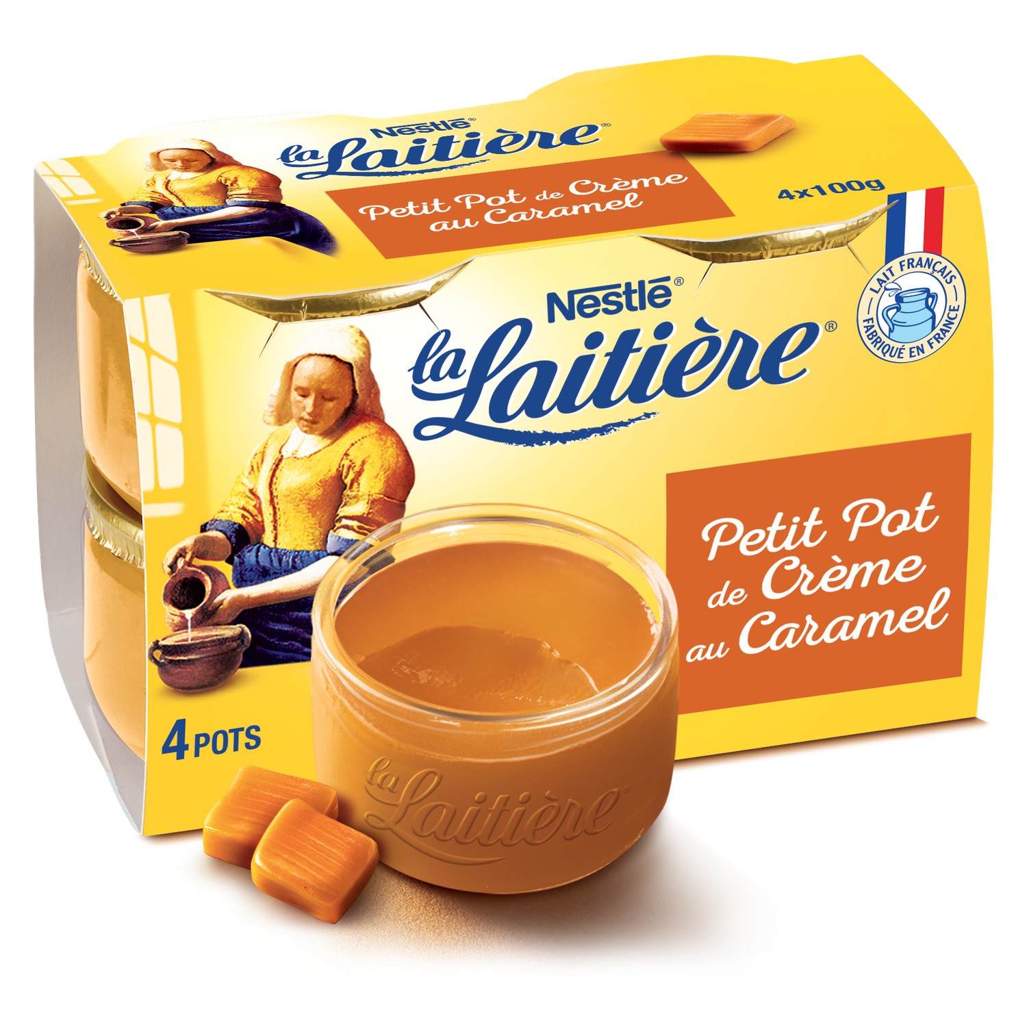 Petit pot de crème au caramel. Ingrédients : Lait entier (53,3%), oeufs frais (11,3%), caramel (10,4%) [sucre, sirop de glucose caramélisé, eau], crème (9,4%) (lait),...