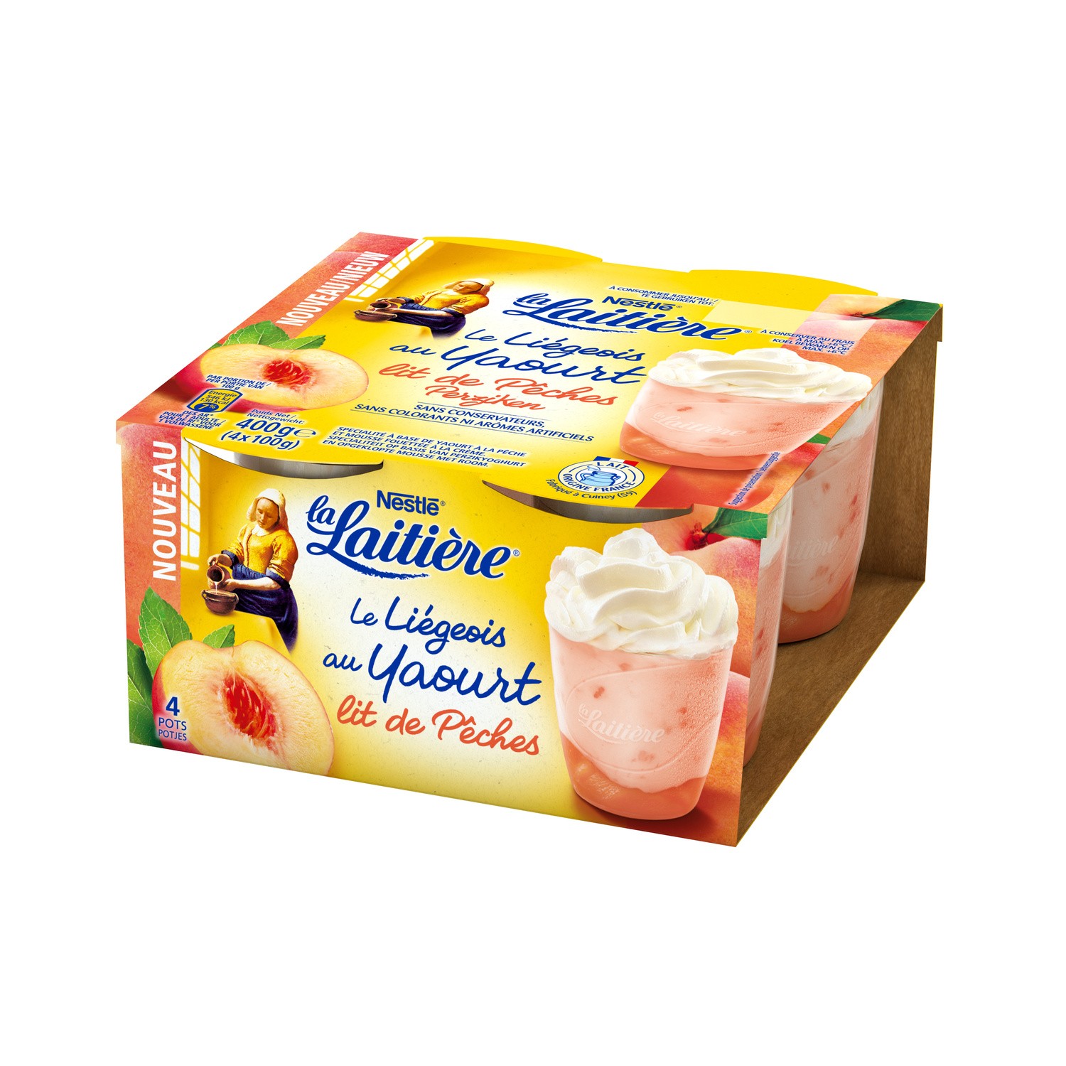 Le Liegeois au yaourt lit de pêches. Ingrédients : Yaourt sucré (52,7%) [lait écrémé, crème (lait), sucre (4%), poudre de lait écrémé, protéines de lait,...