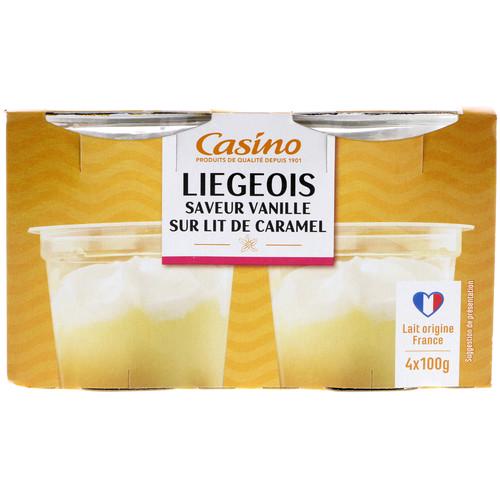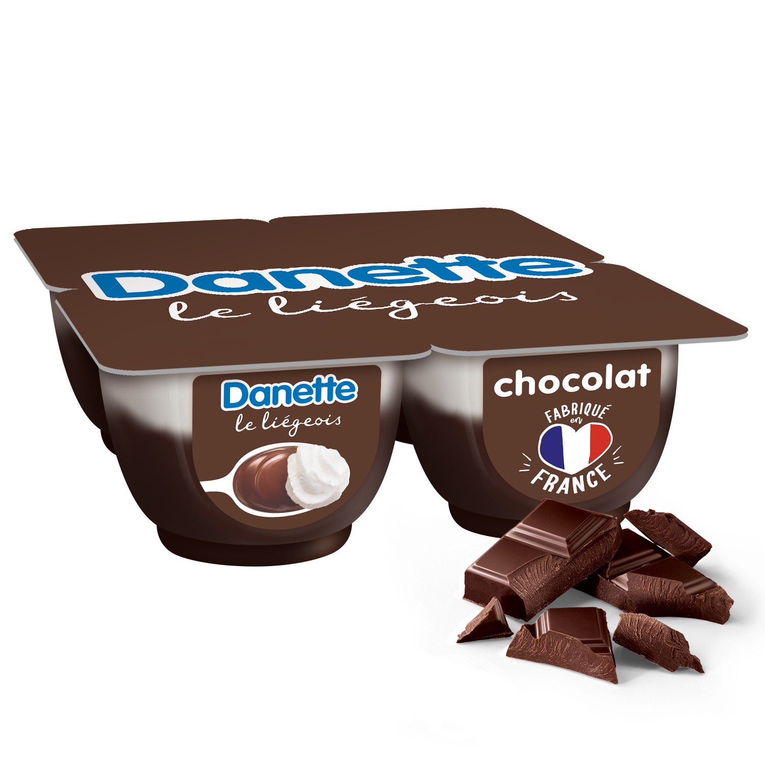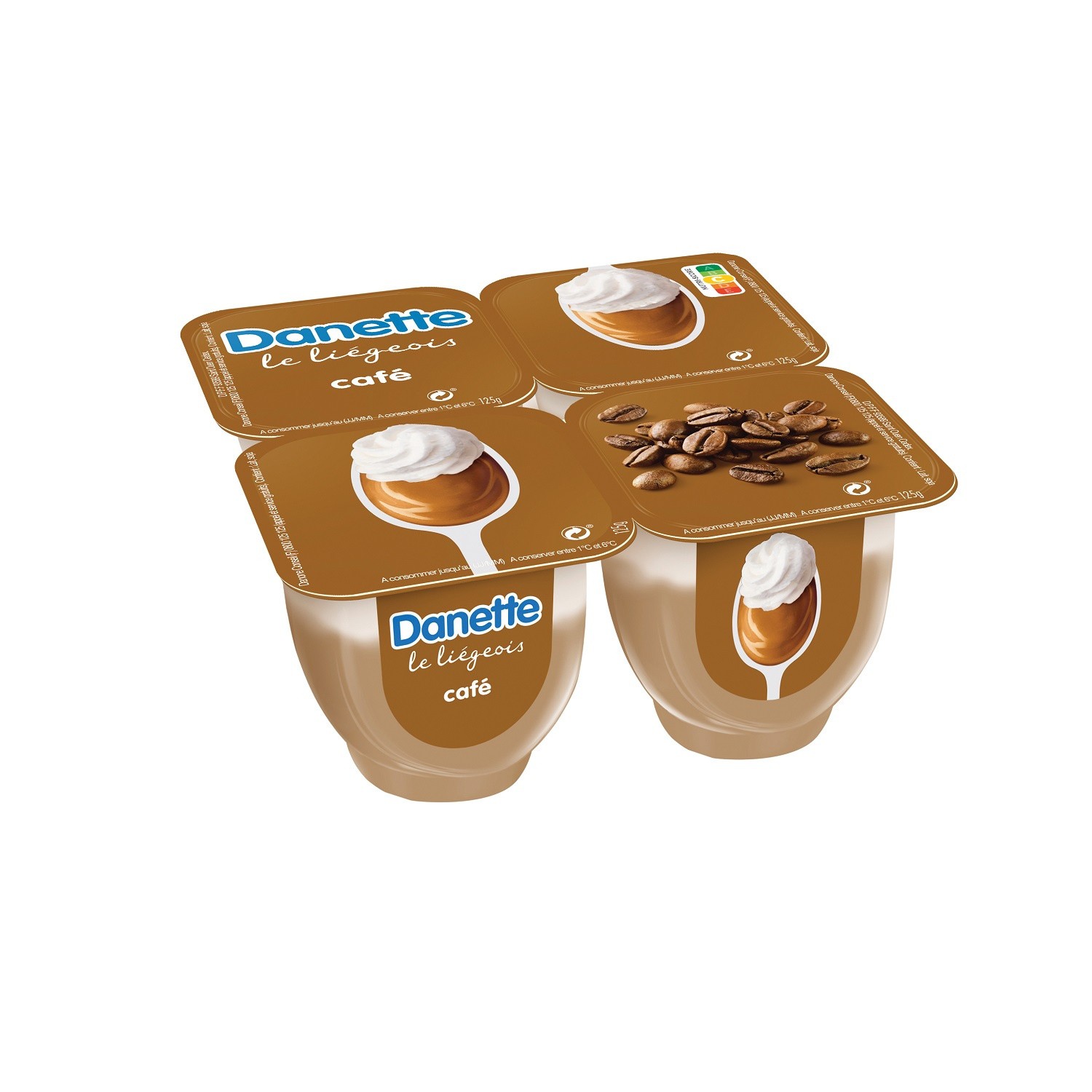 Danette Le Liégeois saveur vanille. Ingrédients : lait entier, crème (lait), sucre, épaississants (amidon transformé, carraghénanes) perméat de petit lait (lactosérum) en poudre, amidon, gélatine...
