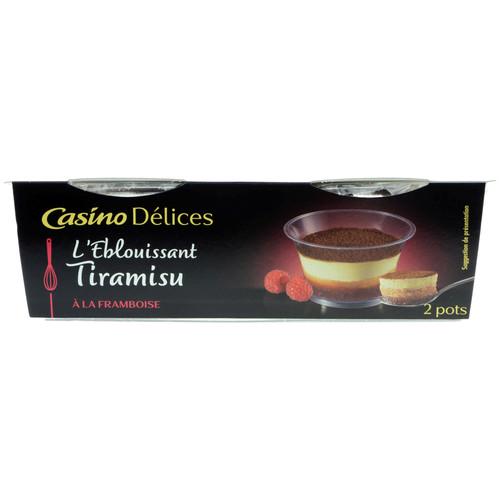 Dessert pâtissier à base de génoise et mascarpone sur lit aux framboises, saupoudré de cacao.. Ingrédients : Spécialité de framboises 30% (framboises 50%* - eau...