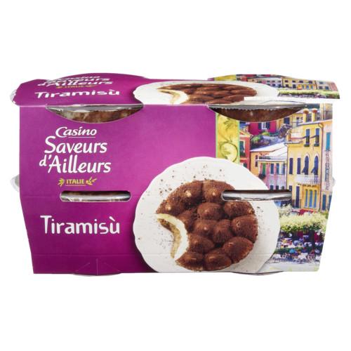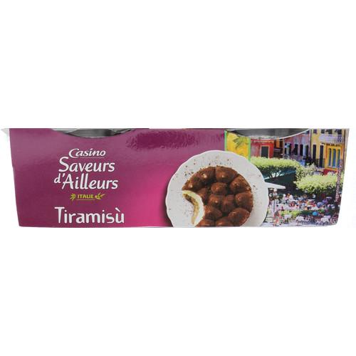 Dessert avec génoise imbibée avec sauce au café, crème au Mascarpone et saupoudrage au cacao. Ingrédients : _lait_ écrémé reconstitué - sirop de glucose -...