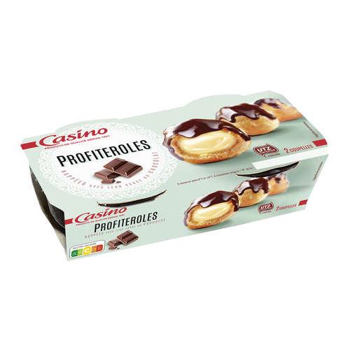 Choux fourrés nappés de sauce (58.7%) au chocolat. Ingrédients : _lait_ écrémé reconstitué - sirop de glucose - eau - choux 6,3% (_oeufs_ - farine...