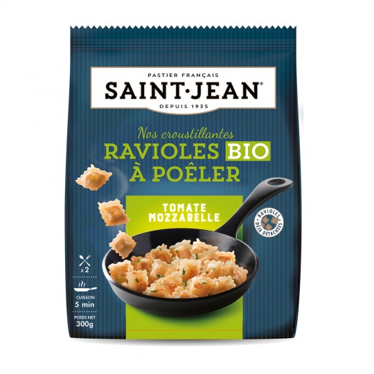 Ravioles Bio à poeler Tomate Mozzarella. Ingrédients : Ravioles à la tomate et à la mozzare 77% (Pâte : farine de blé tendre, eu ,...