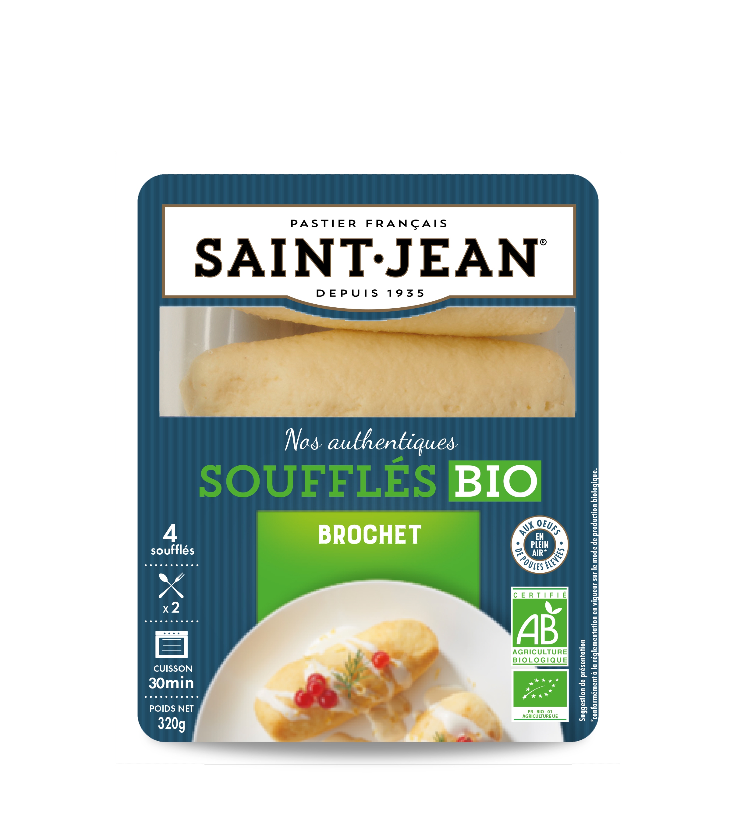 Soufflés au Brochet bio. Ingrédients : _Œufs_, eau, semoule de _blé_ dur, _beurre_, chair de _brochet_ 3,4%, sel, poudre de _lait_, arôme naturel (_poisson_, _lait_)....