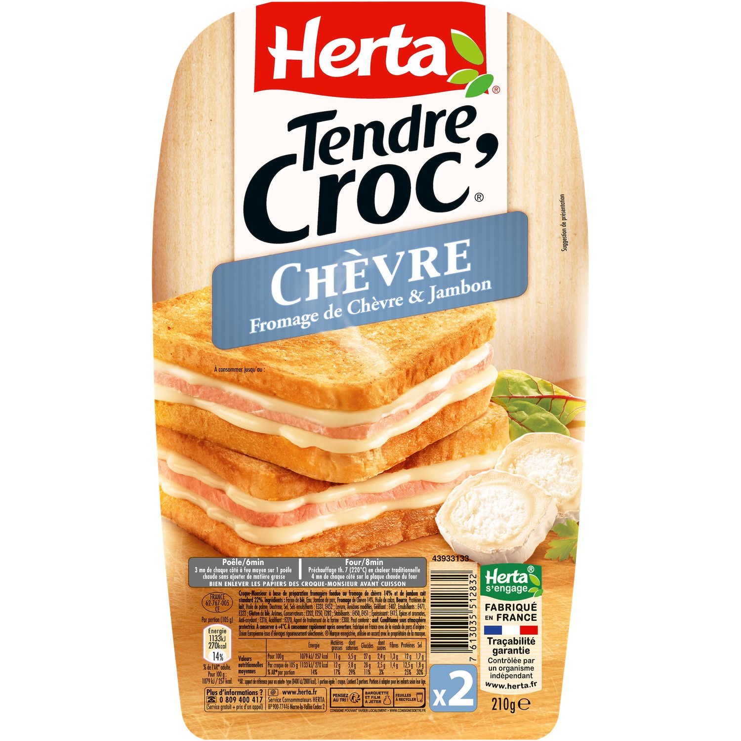 Croque-monsieur à base de préparation fromagère fondue de chèvre et de jambon cuit standard 22%. Ingrédients : Farine de _blé_, Eau, Jambon de porc, _Fromage_...