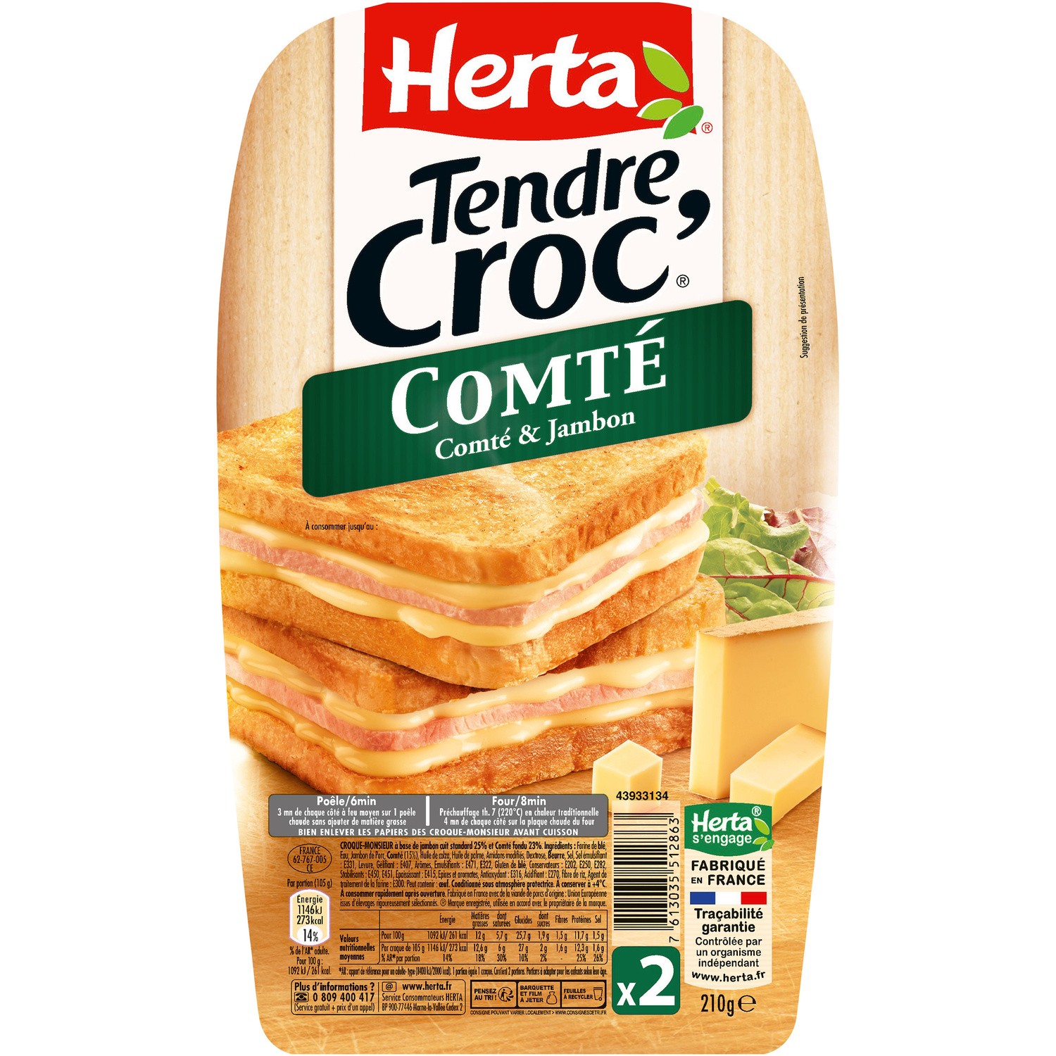 Croque monsieur. Ingrédients : Farine de _blé_, eau, jambon de porc, _comté_ 16%, huile de colza, _beurre_, huile de palme, amidons modifiés, dextrose, sel, sels...