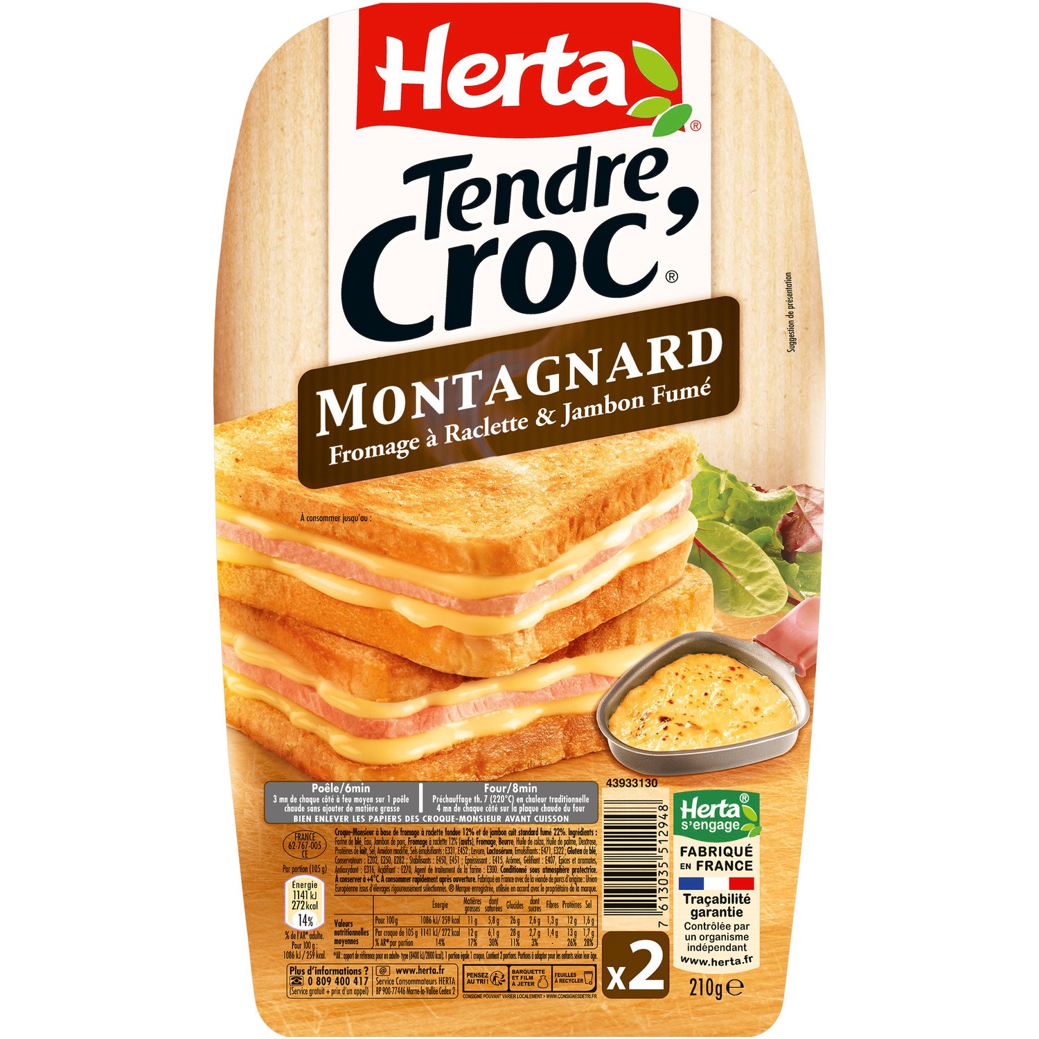 Croque-Monsieur à base de fromage à raclette fondue et de jambon cuit standard fumé 22%. Ingrédients : Farine de _blé_, eau, jambon de porc, _fromage_...