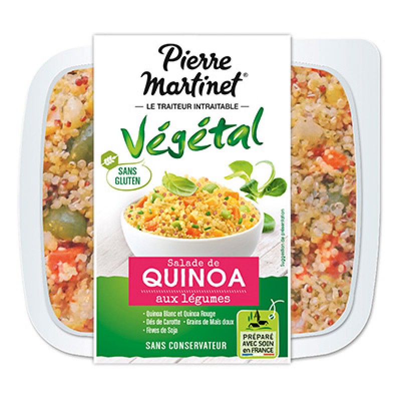 Salade de quinoa aux légumes. Ingrédients : quinoa 42% (blanc et rouge), carottes cuites 9,9%, maïs 8,8%, fèves de soja 6,8%, huile de colza, couscous...
